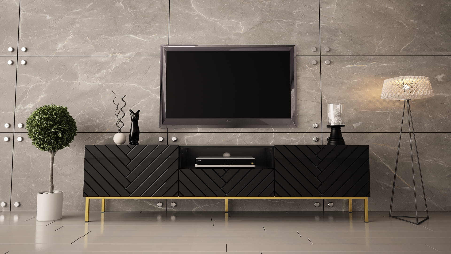 Szerokość 190 cm daje wygodne miejsce pod telewizor i dodatkowy sprzęt. Mebel dobrze wygląda pod większym ekranem i tworzy spójną strefę RTV. Czarny połysk w połączeniu ze złotym stelażem to bardzo modne zestawienie. To szafka pod TV czarna, która podkreśla styl salonu.