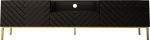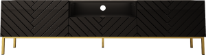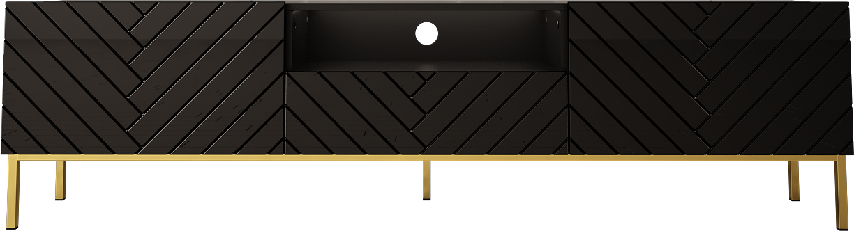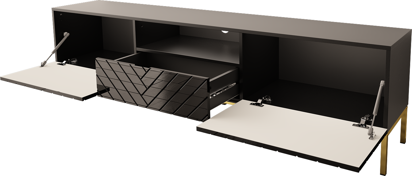 Szafka RTV czarna połysk GALA 190 cm to elegancki mebel z frezowanymi frontami i złotym stelażem, który od razu przyciąga uwagę. Połączenie czarnego połysku z metalowymi detalami nadaje wnętrzu nowoczesnego charakteru. To stylowa szafka pod TV, która świetnie sprawdzi się w salonie.