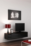 Szafka RTV Czarna VIGO 140 cm to kompaktowy, wiszący model z gładkimi frontami w połysku i wygodnym systemem push-click, idealny dla osób poszukujących stylowej i funkcjonalnej wiszącej szafki RTV.