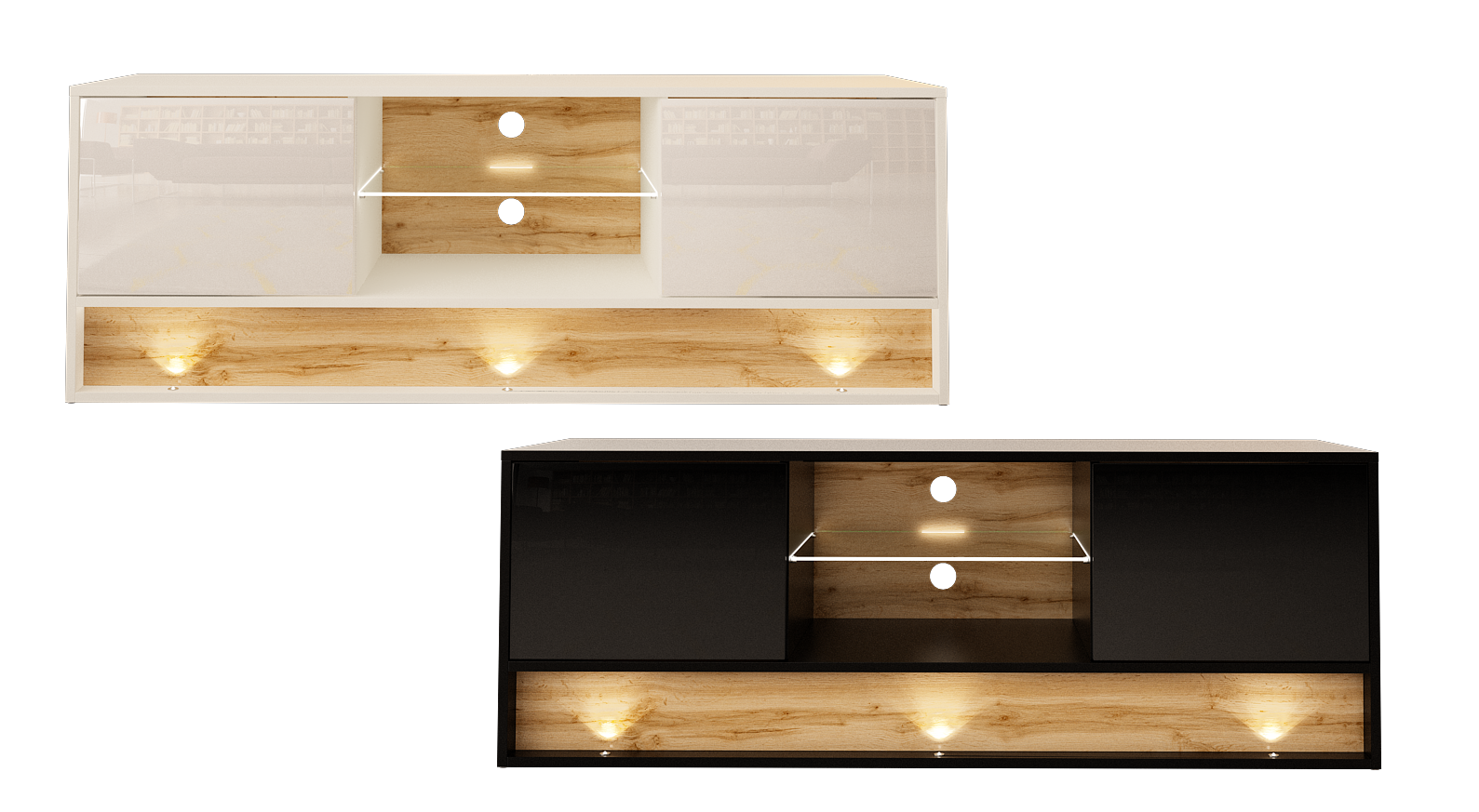 Korpus wykonano z płyty laminowanej, a fronty z MDF w połysku, co zapewnia estetyczny wygląd i trwałość. Materiały są odporne na codzienne użytkowanie i łatwe w czyszczeniu. Oświetlenie LED dodatkowo podkreśla design mebla i tworzy przyjemny klimat wieczorem. To solidna szafka RTV 140 cm, która posłuży przez długi czas.