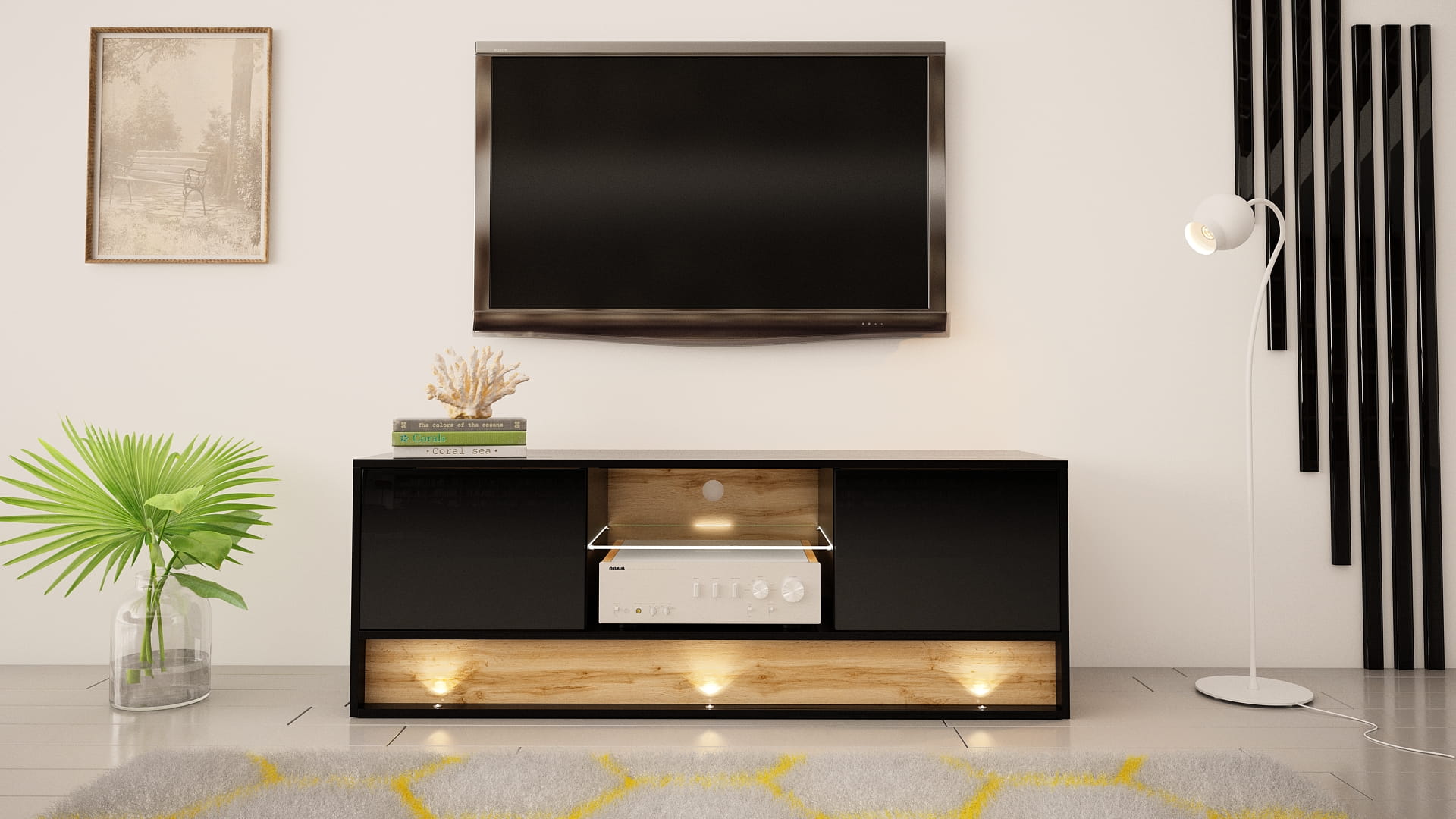 Model VISION w czarnej wersji to propozycja dla osób, które lubią nowoczesne i wyraziste wnętrza. Czarny połysk wygląda elegancko i dobrze komponuje się z jasnymi ścianami oraz drewnianymi dodatkami. Wstawka w kolorze dąb wotan ociepla całość i przełamuje ciemną bryłę. To czarna szafka RTV, która przyciąga uwagę i dobrze wygląda w salonie.