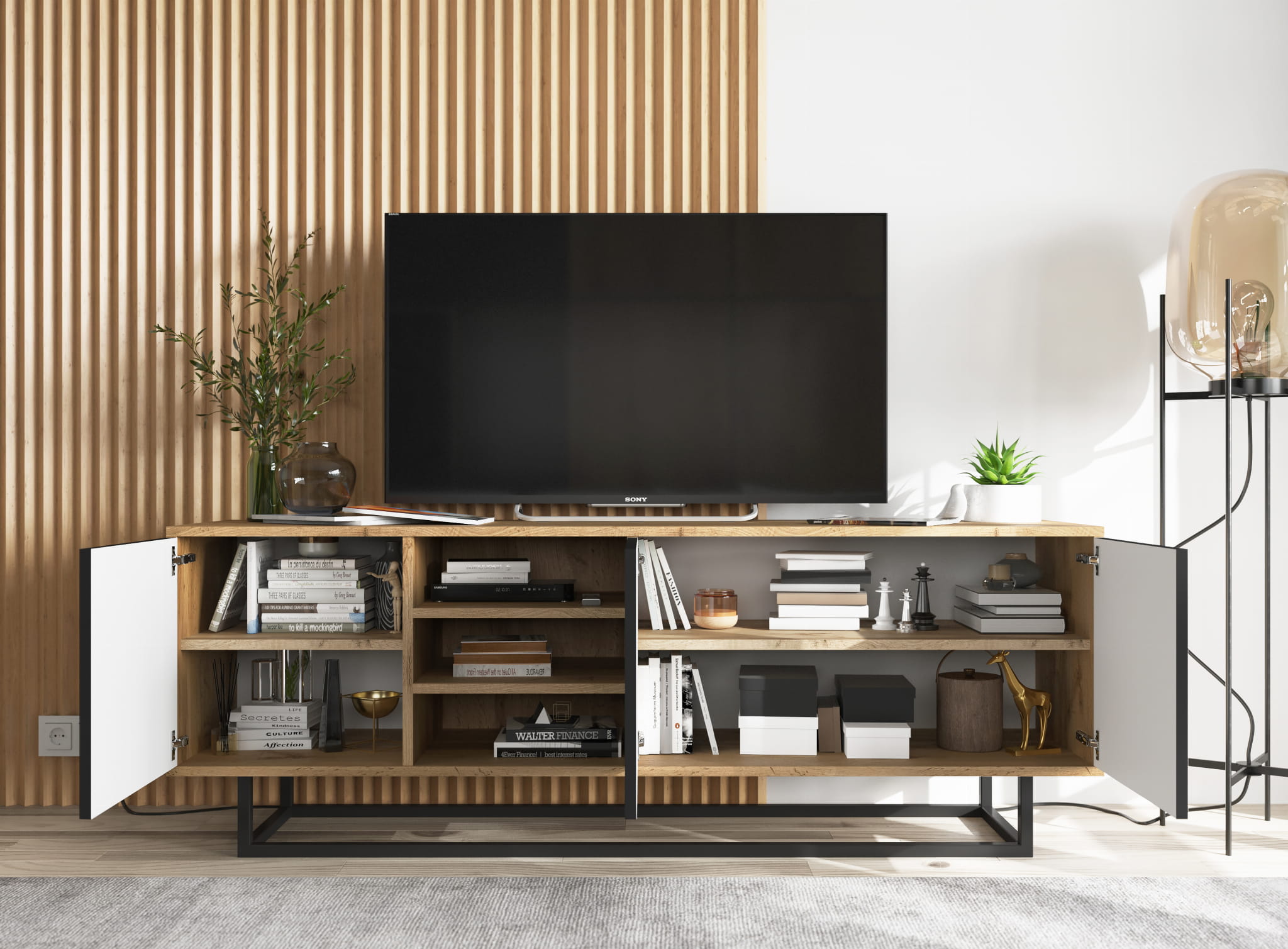 Korpus i fronty wykonano z płyty laminowanej, co zapewnia odporność na codzienne użytkowanie oraz łatwość utrzymania w czystości. Metalowy stelaż dostępny w dwóch kolorach nadaje lekkości i nowoczesnego charakteru. To solidna szafka pod TV na nóżkach, która łączy naturalny wygląd z nowoczesnym stylem.