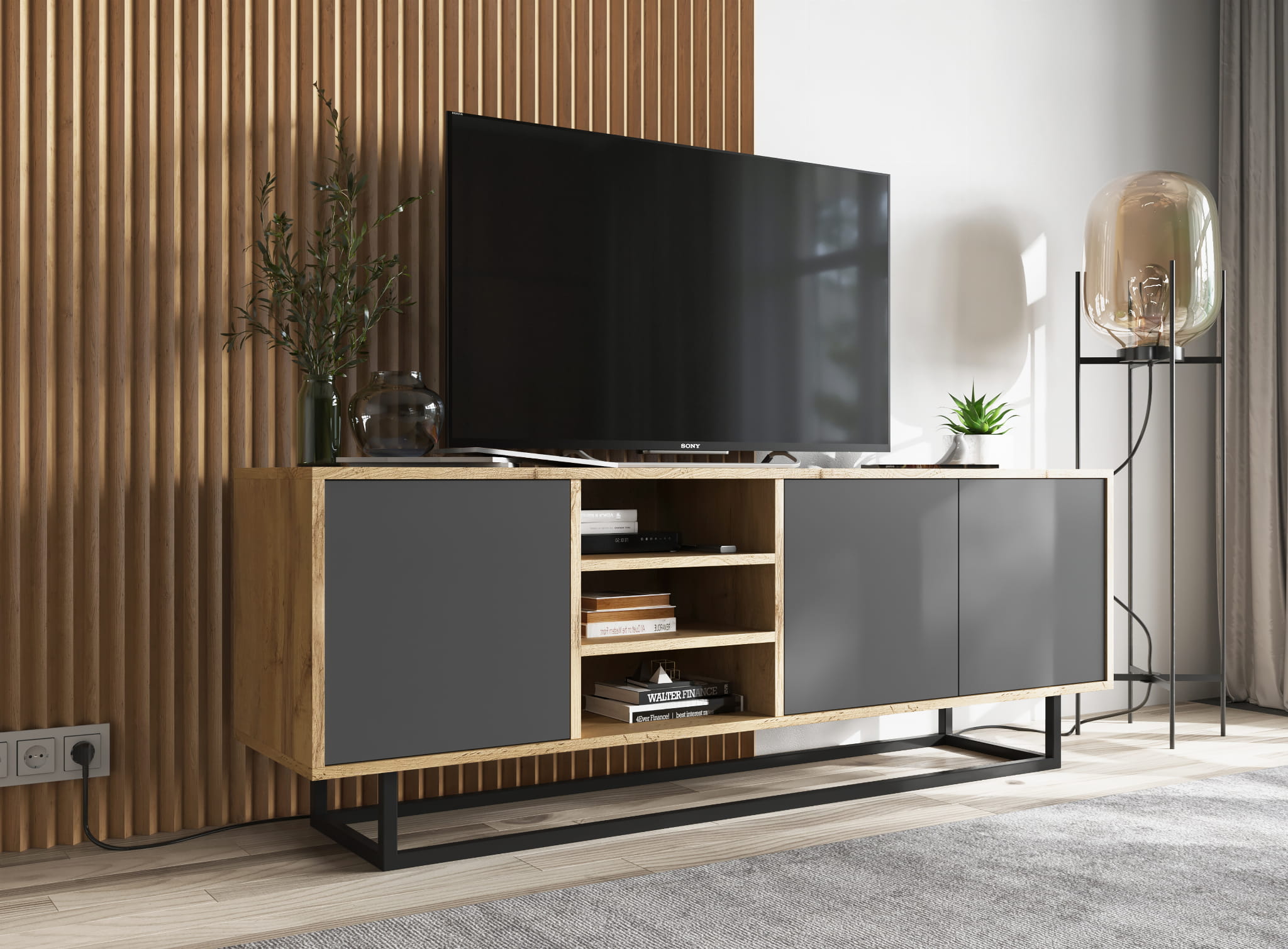 Szafka została zaprojektowana tak, aby łączyć estetykę z wygodą. Zamykane fronty pozwalają ukryć rzeczy, a otwarta półka zapewnia szybki dostęp do sprzętu. To praktyczna szafka RTV 150 cm, która dobrze sprawdzi się zarówno w mniejszych, jak i większych salonach.