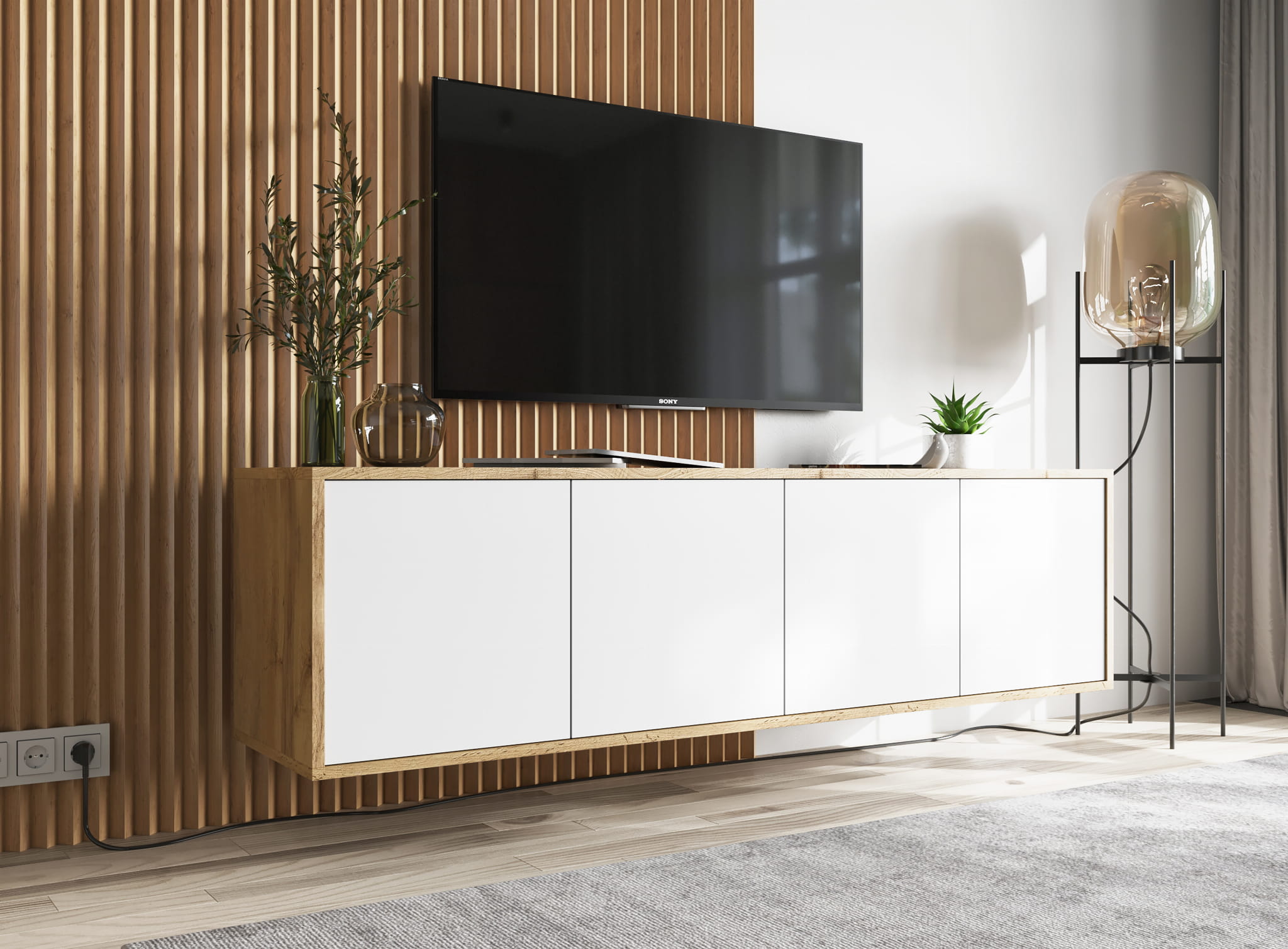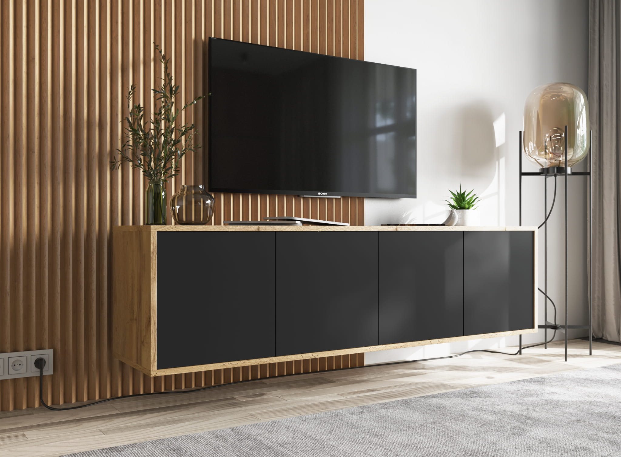 Zamknięta forma z czterema frontami pozwala zachować porządek i ukryć wszystkie elementy wyposażenia RTV. Naturalny odcień drewna dobrze komponuje się z czernią, bielą oraz metalowymi dodatkami, tworząc spójną aranżację. Ta szafka pod TV do salonu sprawdzi się zarówno w nowoczesnych, jak i bardziej klasycznych przestrzeniach.
