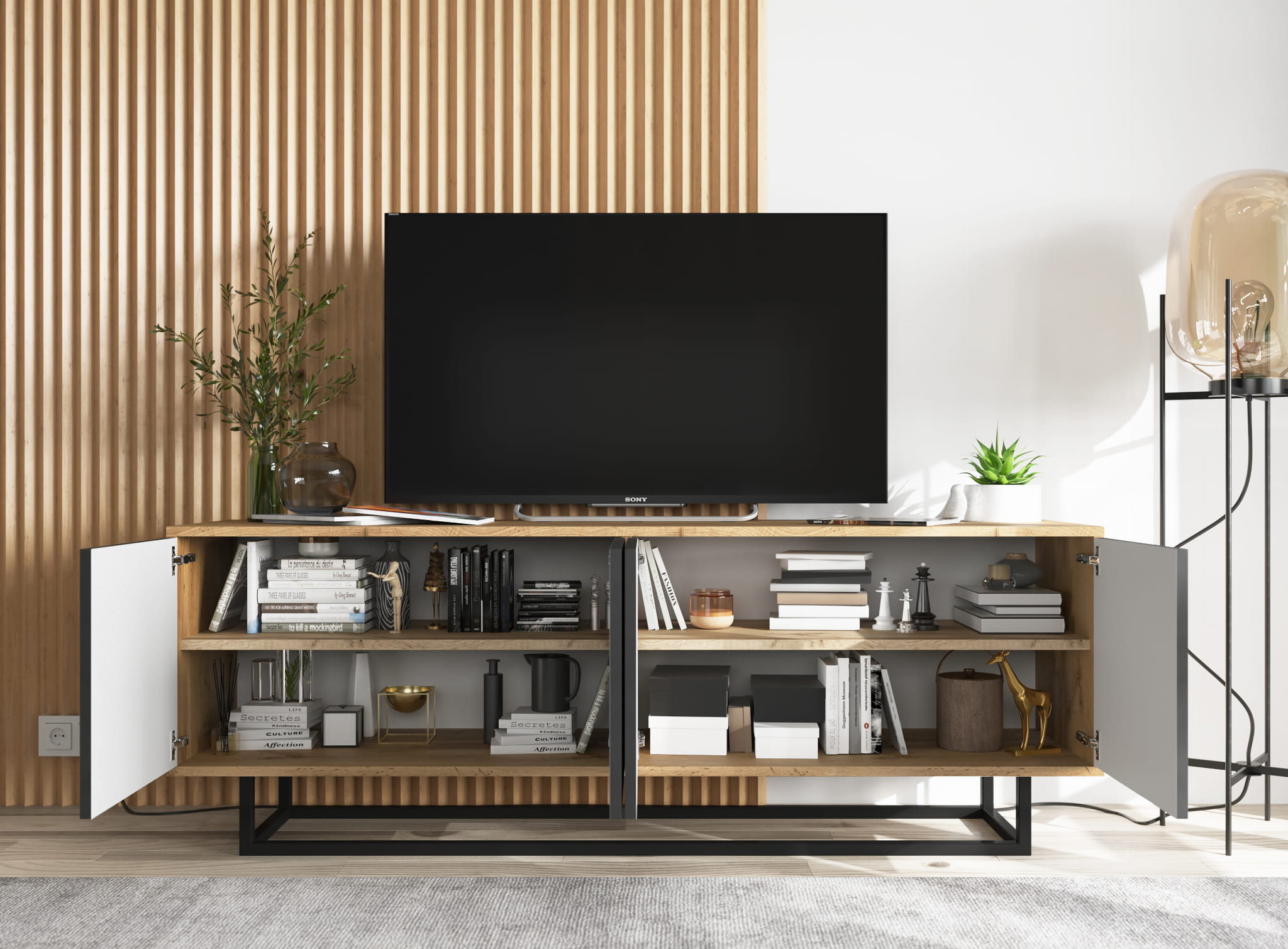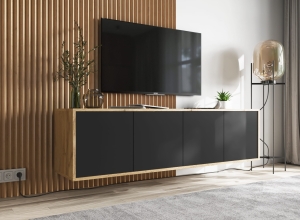 Korpus i fronty wykonano z trwałej płyty laminowanej, odpornej na codzienne użytkowanie. Metalowy stelaż dostępny w dwóch kolorach nadaje bryle lekkości i podkreśla nowoczesny charakter. To uniwersalna szafka pod TV 150 cm, która łączy funkcjonalność z naturalnym wyglądem.