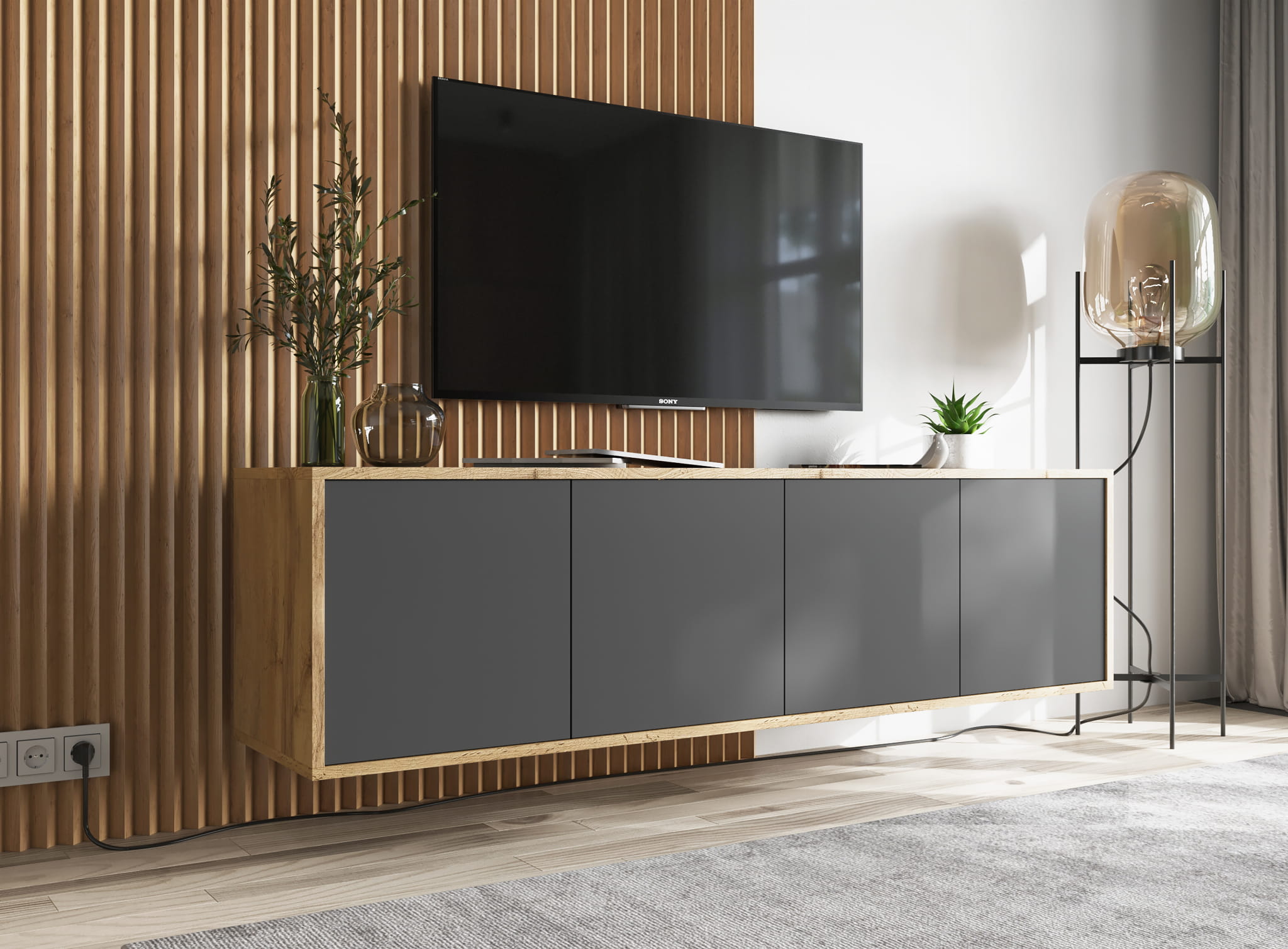 Szafka RTV dąb wotan POLI 2 150 cm to praktyczny mebel z czterema zamykanymi frontami i wewnętrznymi półkami, który pozwala wygodnie uporządkować sprzęt oraz dodatki. Prosta bryła i system push to open sprawiają, że doskonale sprawdzi się jako szafka pod TV w nowoczesnym salonie.