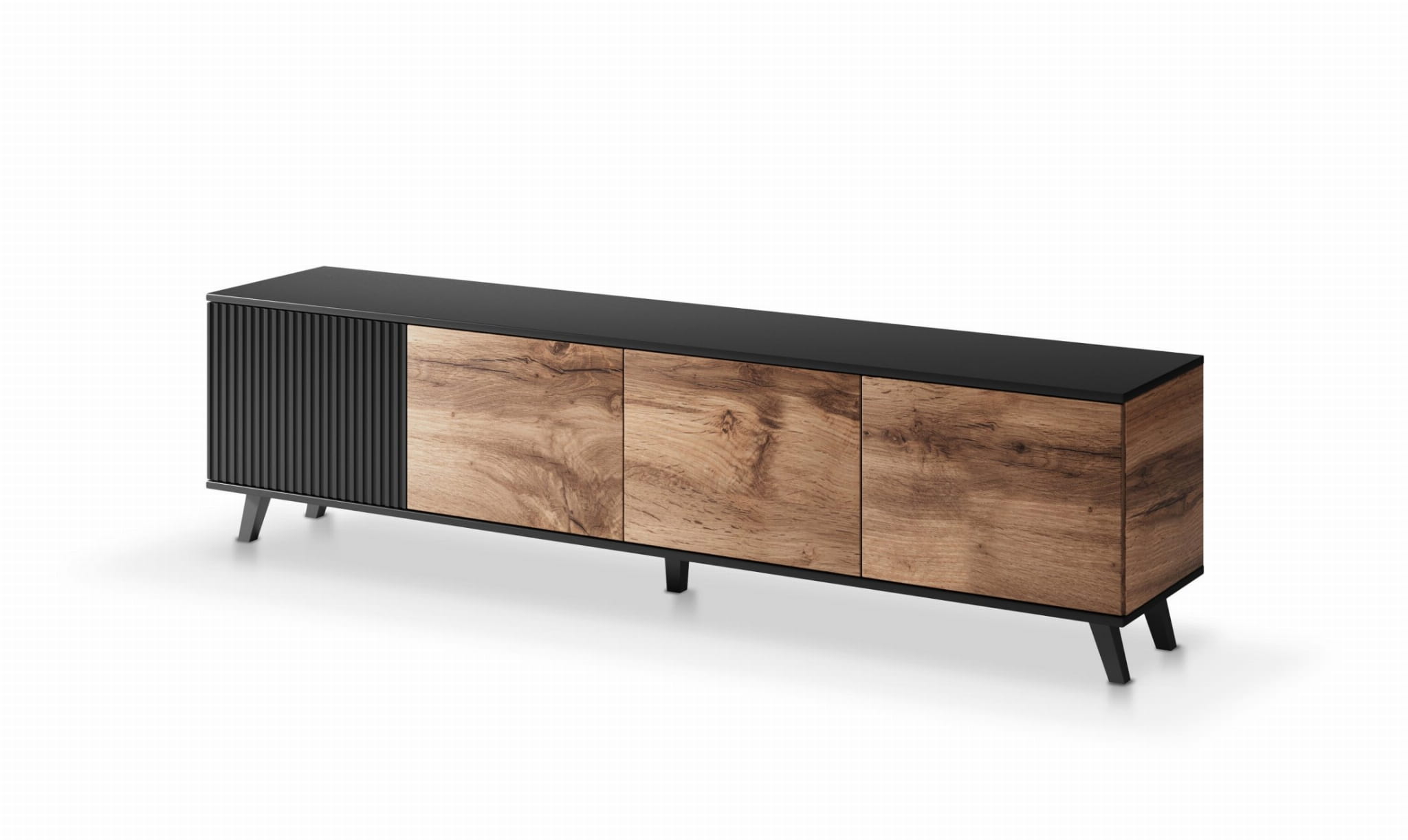 Szafka RTV dąb wotan RANDOM 200 cm to nowoczesny mebel z zamykanymi frontami i praktycznym układem, który pozwala wygodnie przechowywać sprzęt oraz dodatki. Połączenie dekoru drewna z czarnymi elementami nadaje jej charakteru i sprawia, że dobrze odnajduje się w różnych aranżacjach. To funkcjonalna szafka pod TV, która sprawdzi się zarówno w mniejszych, jak i większych salonach.