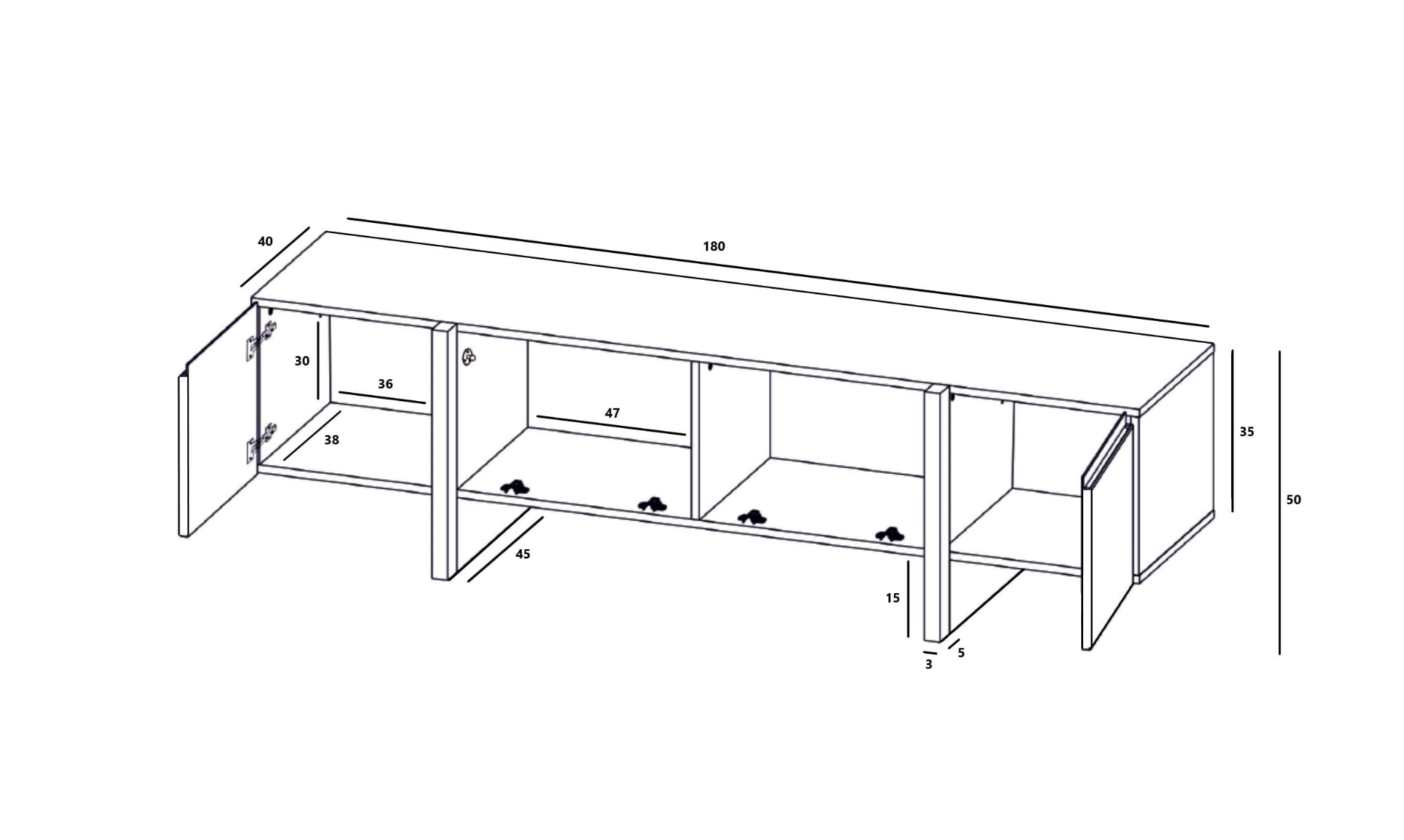 Korpus wykonano z trwałej płyty laminowanej, a fronty z MDF, co zapewnia estetykę i odporność na codzienne użytkowanie. Stabilna konstrukcja i proporcje sprawiają, że mebel dobrze prezentuje się pod telewizorem i zachowuje lekkość wizualną. To funkcjonalna szafka pod telewizor 180 cm, która łączy styl z trwałością.