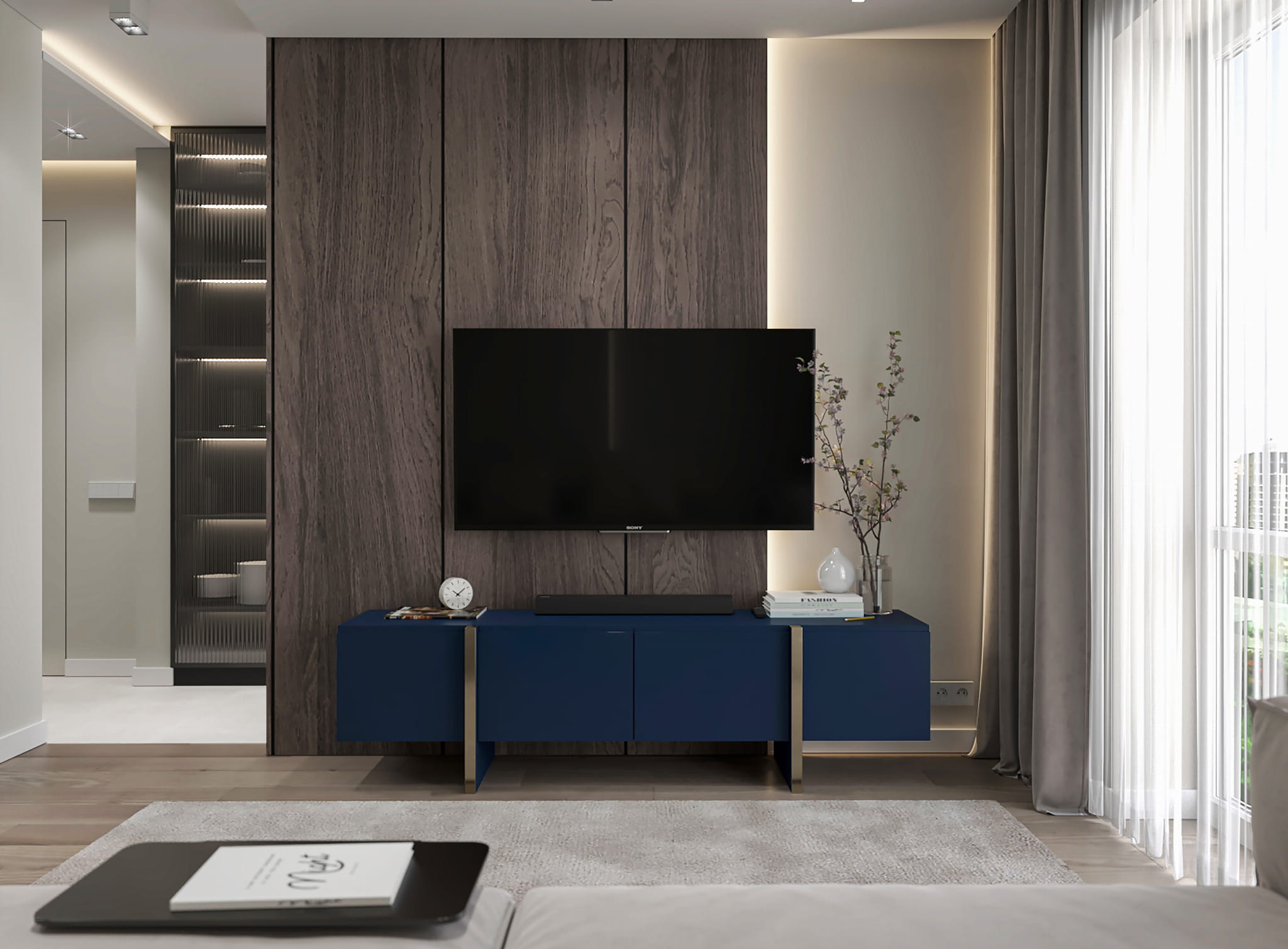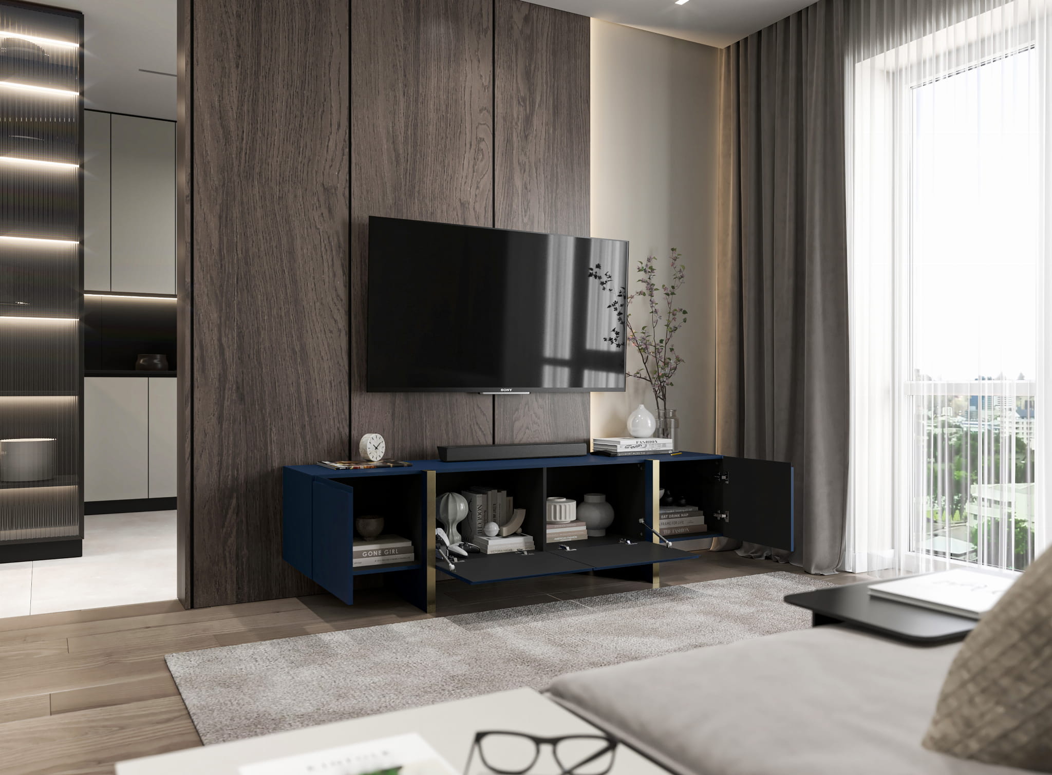 Stonowany, głęboki odcień granatu świetnie komponuje się ze złotymi detalami oraz jasnymi ścianami, tworząc elegancką i spójną aranżację. Zabudowana forma sprawia, że mebel wygląda lekko, mimo swojej szerokości. Ta szafka pod TV granatowa może być zarówno subtelnym tłem dla aranżacji, jak i jej mocnym akcentem.