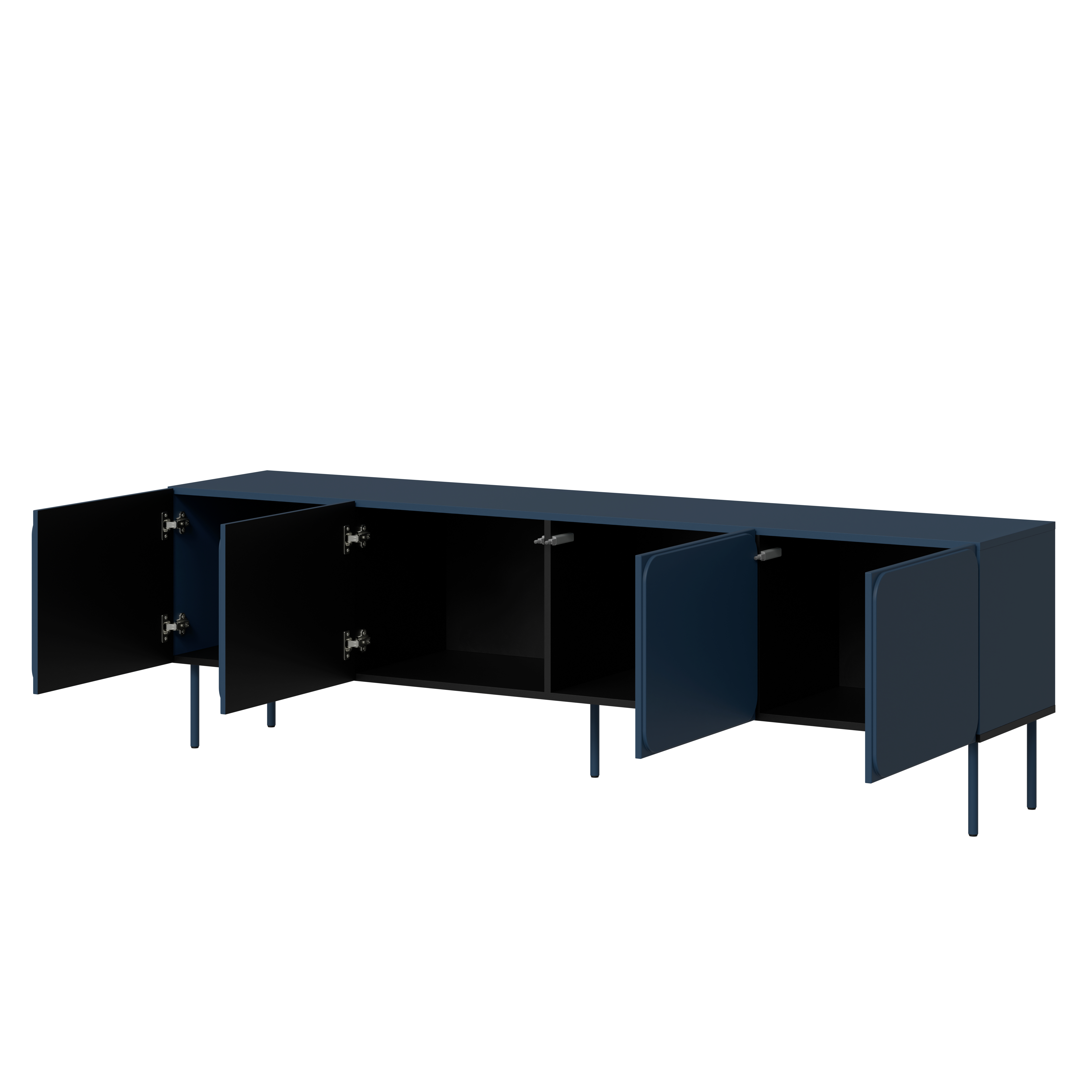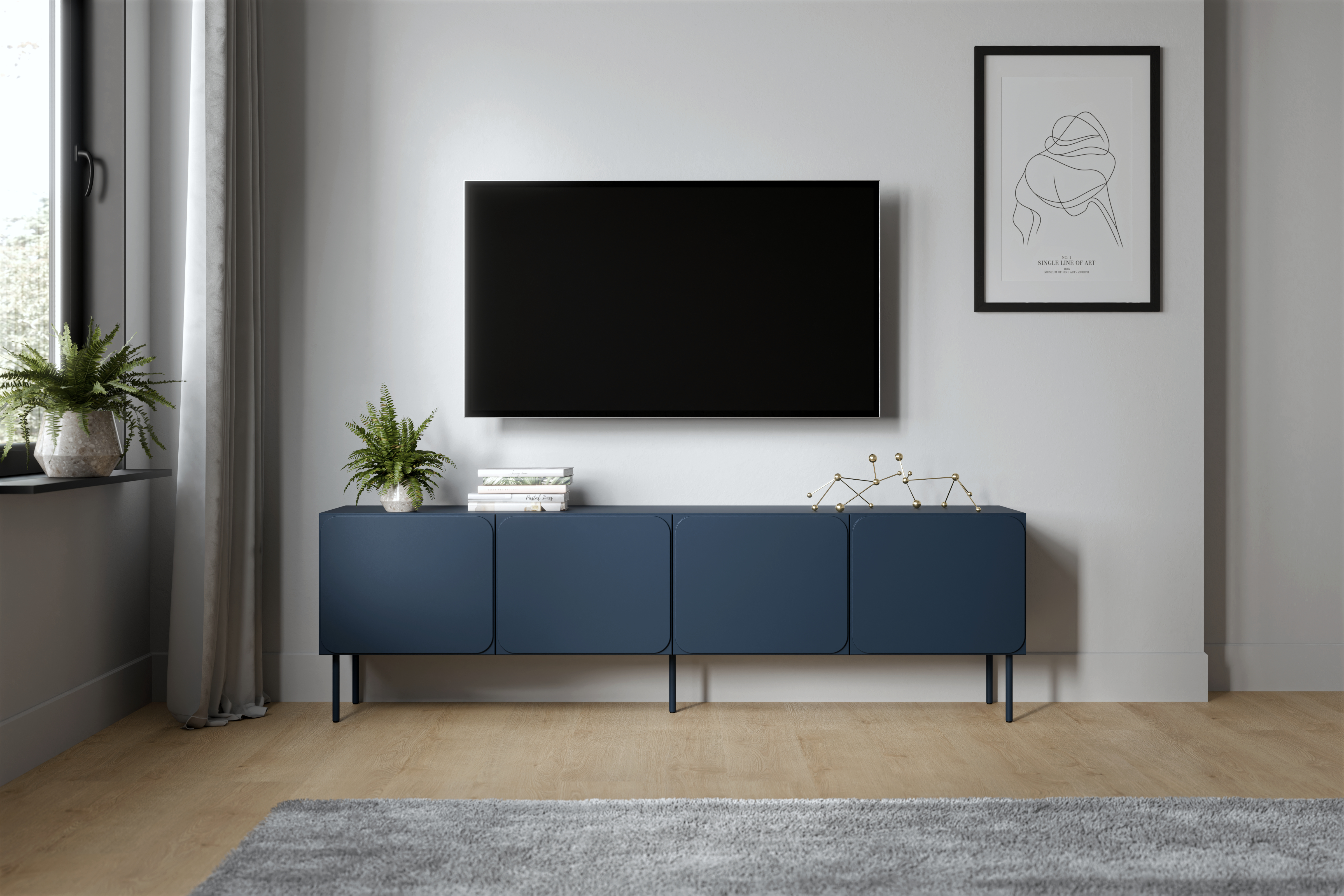 Szafka RTV Granatowa RAFAEL 4D 200 cm to wyrazista, elegancka forma o frezowanych frontach, która nadaje wnętrzu głębi i nowoczesnego charakteru. Smukłe metalowe nóżki podkreślają lekkość bryły, a matowe wykończenie w intensywnym granacie wprowadza do salonu szlachetną atmosferę. W dopracowanych aranżacjach doskonale odnajduje się jako szafka RTV, tworząc stylowe centrum strefy multimedialnej.