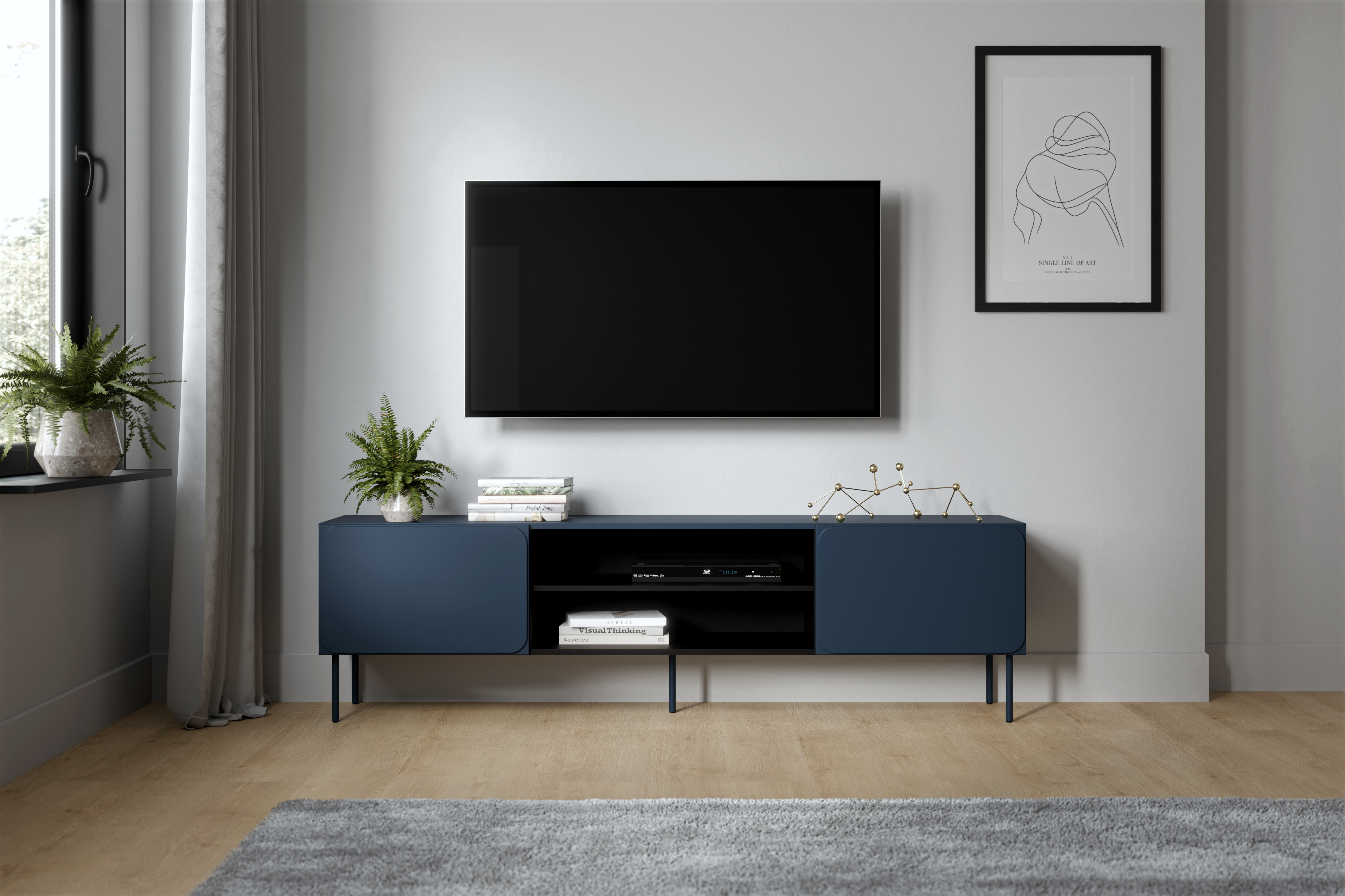 Matowa powierzchnia w intensywnym odcieniu granatu wprowadza do wnętrza elegancję i nowoczesną energię. Szafka RTV na nóżkach dzięki metalowej podstawie o wysokości 20 cm zyskuje wizualną lekkość, a jednocześnie stabilność. To idealne rozwiązanie do przestrzeni, w których ciemniejsze barwy łączą się z jasnymi ścianami, złotymi detalami lub naturalnym drewnem.