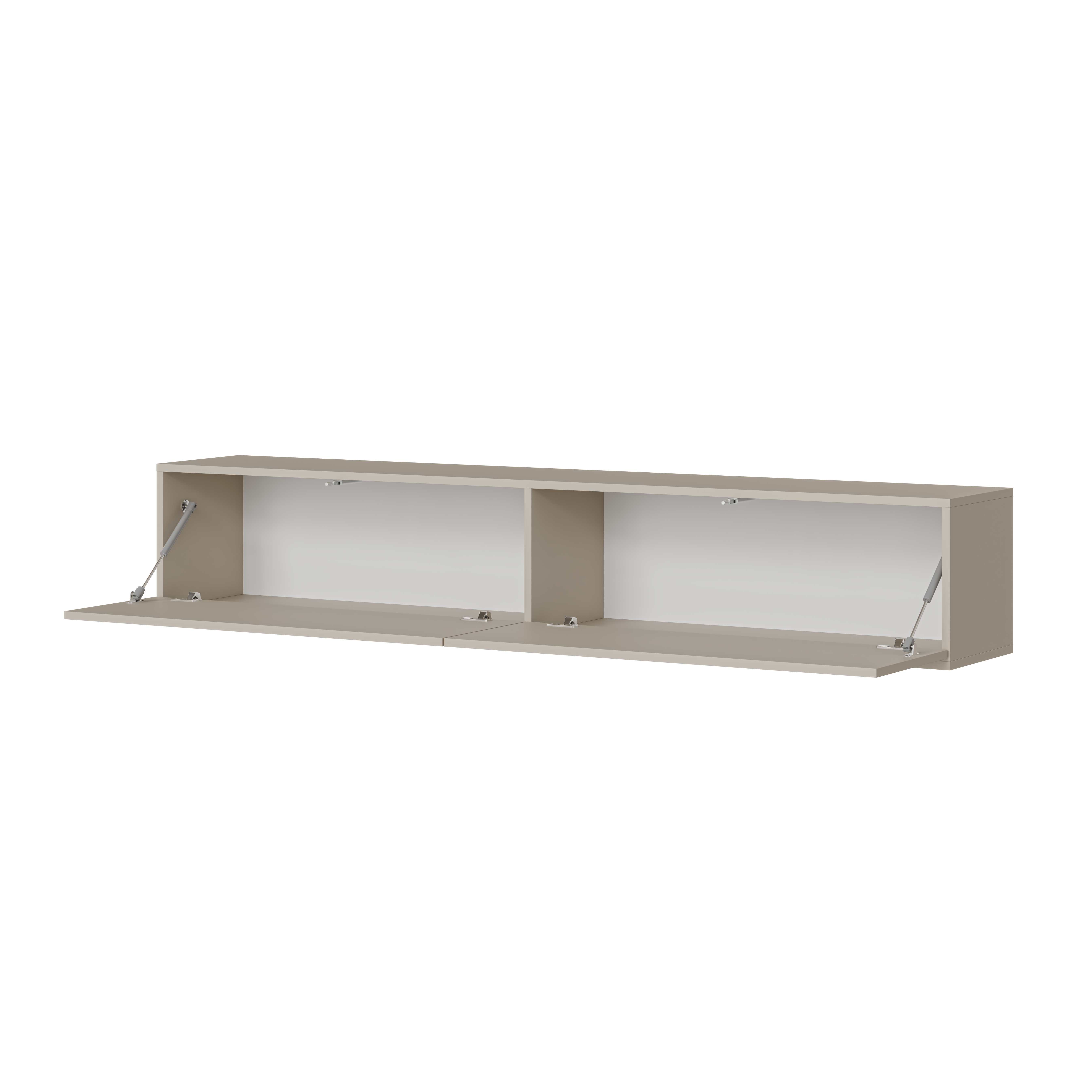 Funkcjonalny układ dwóch klap otwieranych do dołu zapewnia wygodny dostęp do przechowywanych akcesoriów i sprzętów. Dwie przestrzenie wewnętrzne pozwalają estetycznie uporządkować strefę RTV, zachowując wizualny ład. W nowoczesnych aranżacjach doskonale sprawdzi się również jako szafka RTV kaszmir wisząca, podkreślając lekkość całej kompozycji.