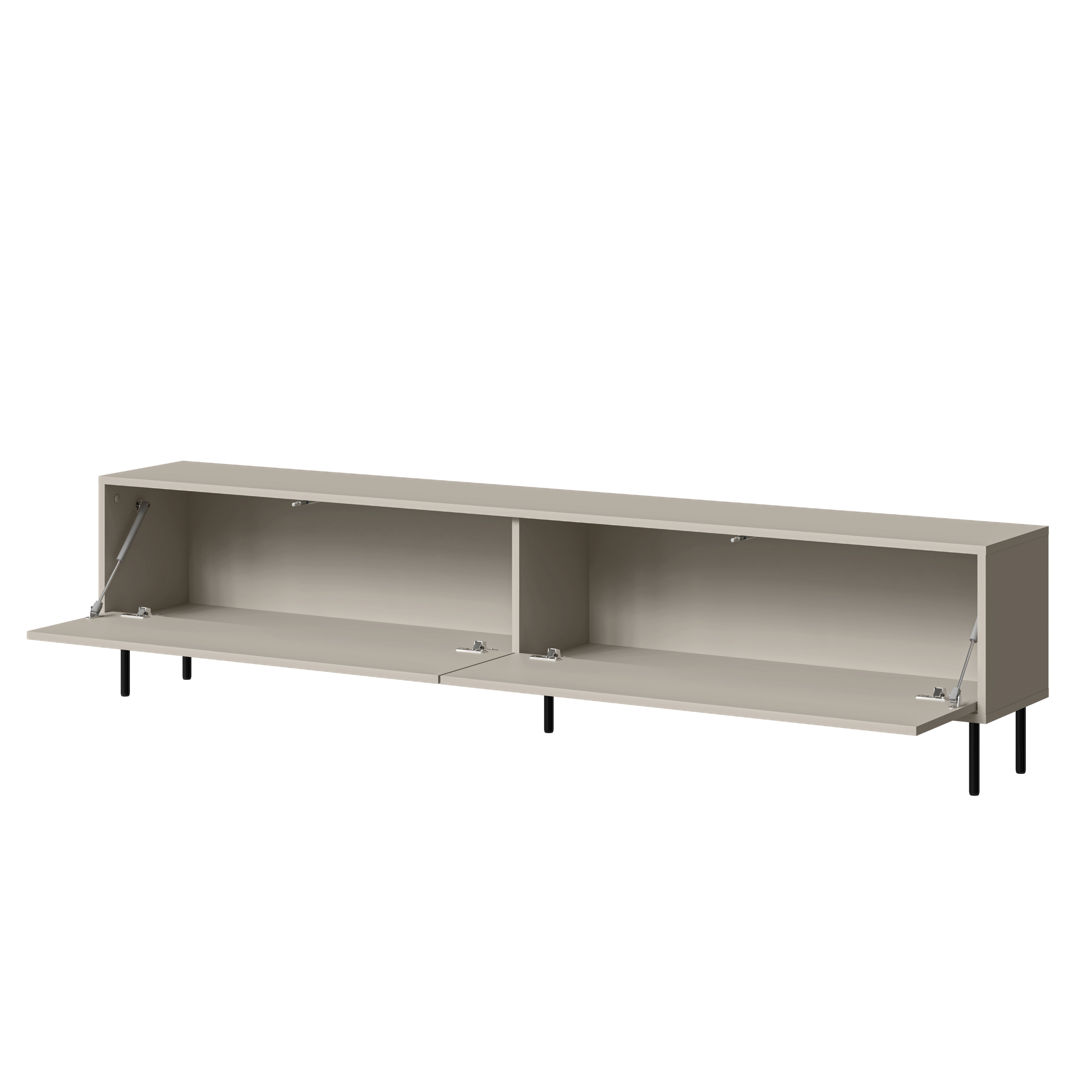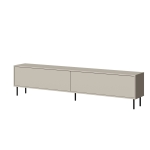 Matowe fronty i korpus w kaszmirowym odcieniu tworzą spójną, elegancką całość, która nie dominuje wnętrza. Czarne, metalowe nóżki dodają bryle lekkości i nowoczesnego charakteru, podkreślając jej dopracowaną formę. Całość doskonale wpisuje się w trend lekkich brył, które subtelnie eksponują linię mebla jako szafka RTV na nóżkach do nowoczesnego salonu.