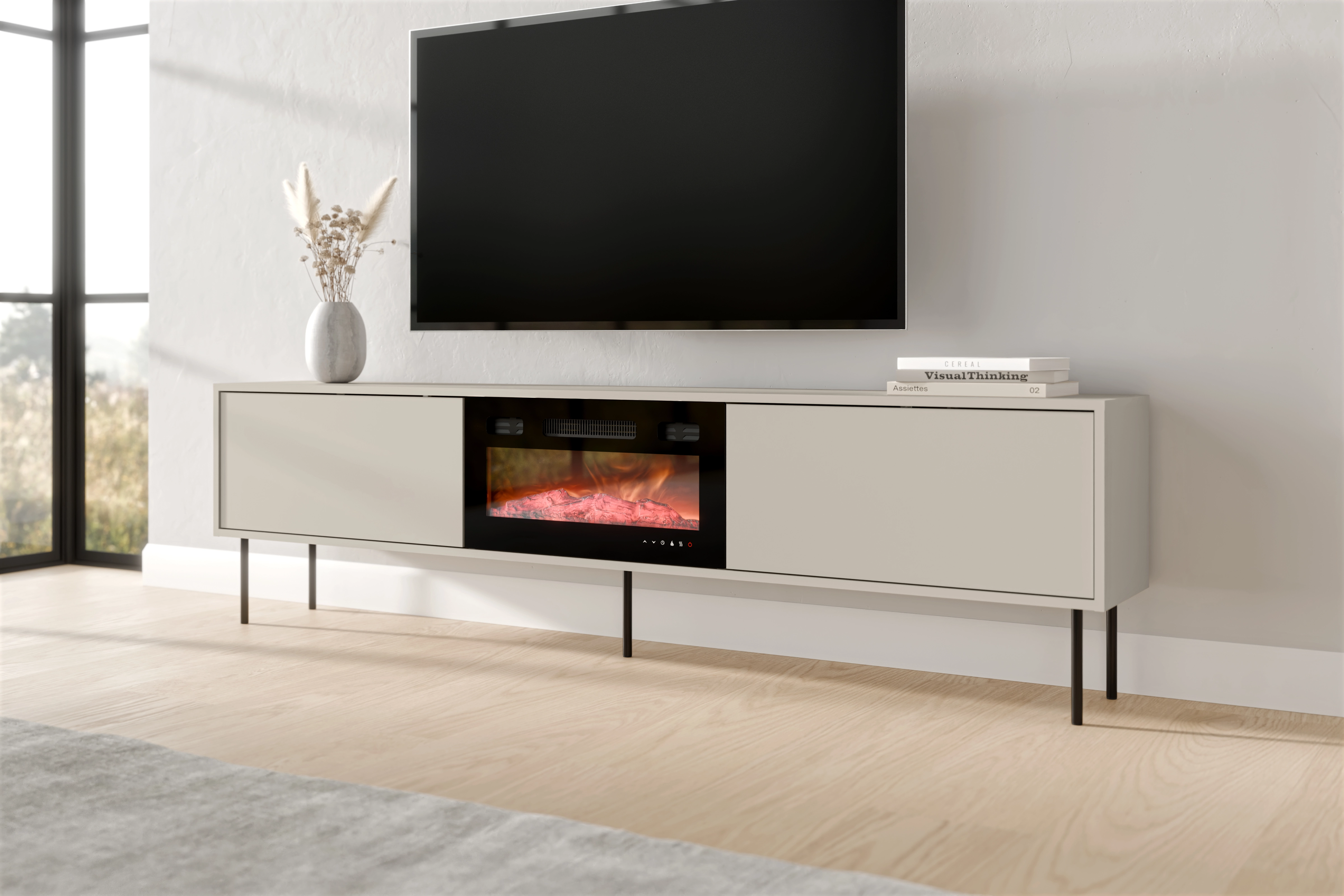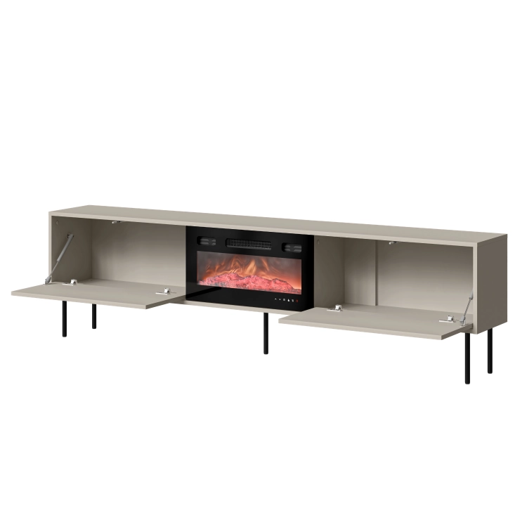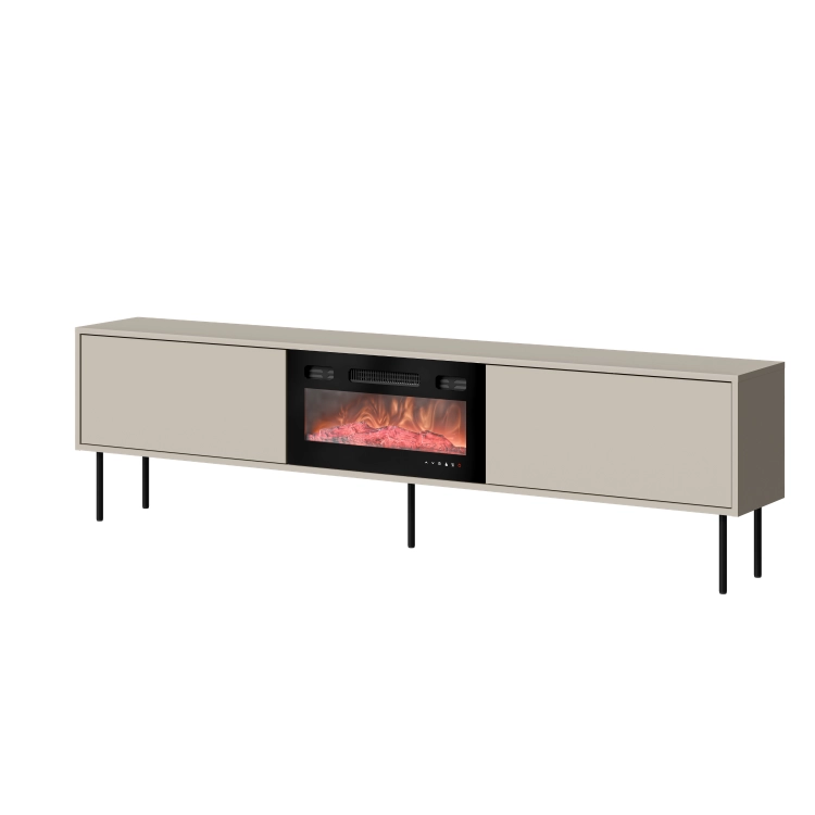 Szafka RTV kaszmir MASHA 200 cm to stylowa szafka pod telewizor z kominkiem, która łączy elegancką formę z funkcjonalnym układem. Idealnie odnajdzie się w nowoczesnych i spokojnych aranżacjach, wprowadzając do wnętrza harmonię i wizualny porządek.