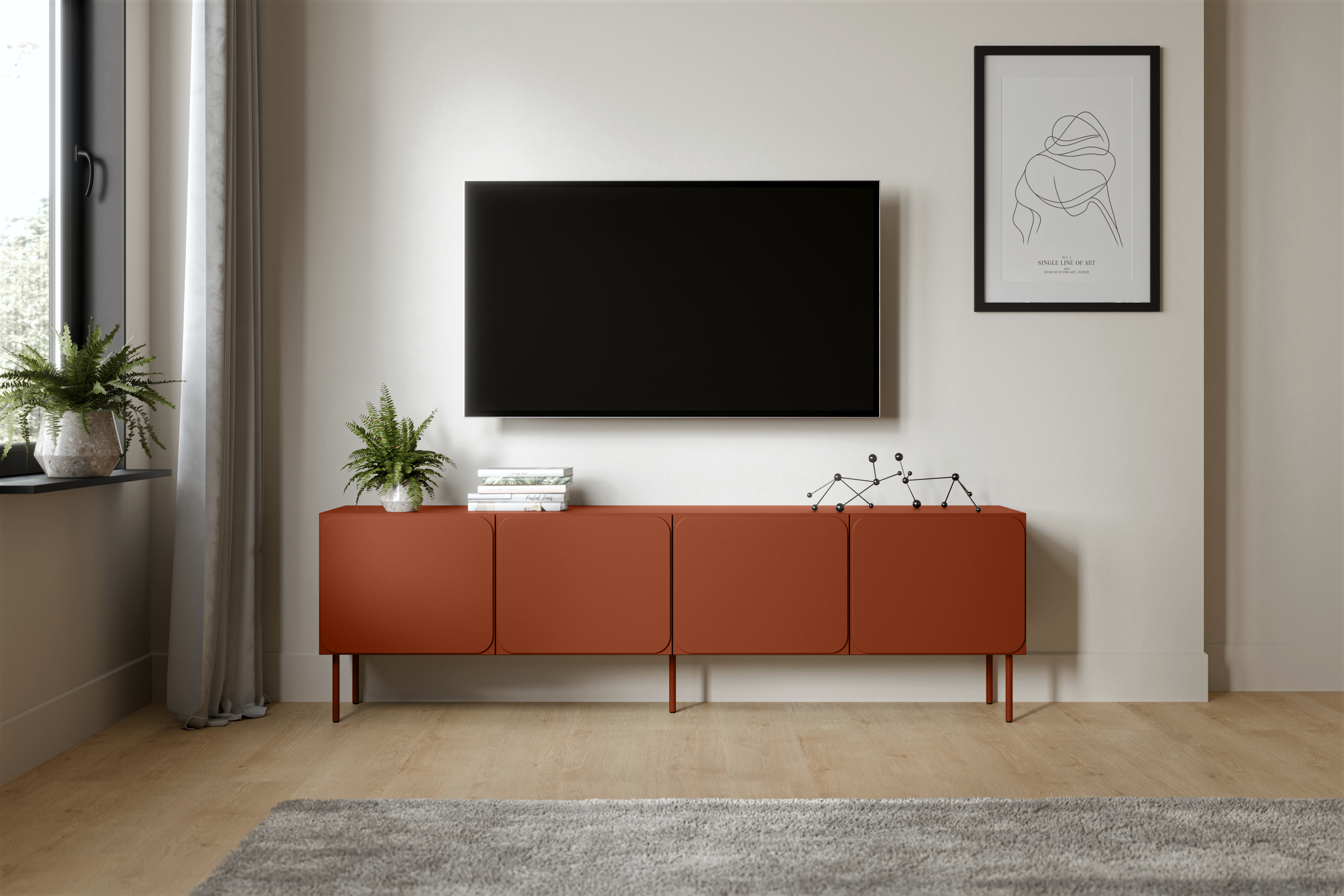 Szafka RTV ruda RAFAEL 200 cm to wyrazisty akcent do wnętrz, które lubią ciepłe kolory i nowoczesną prostotę formy. Matowe wykończenie w odcieniu rudości nadaje aranżacji charakteru, a smukłe nóżki podkreślają lekkość bryły. W tej roli doskonale odnajduje się szafka RTV, budując spójną strefę telewizyjną w salonie.
