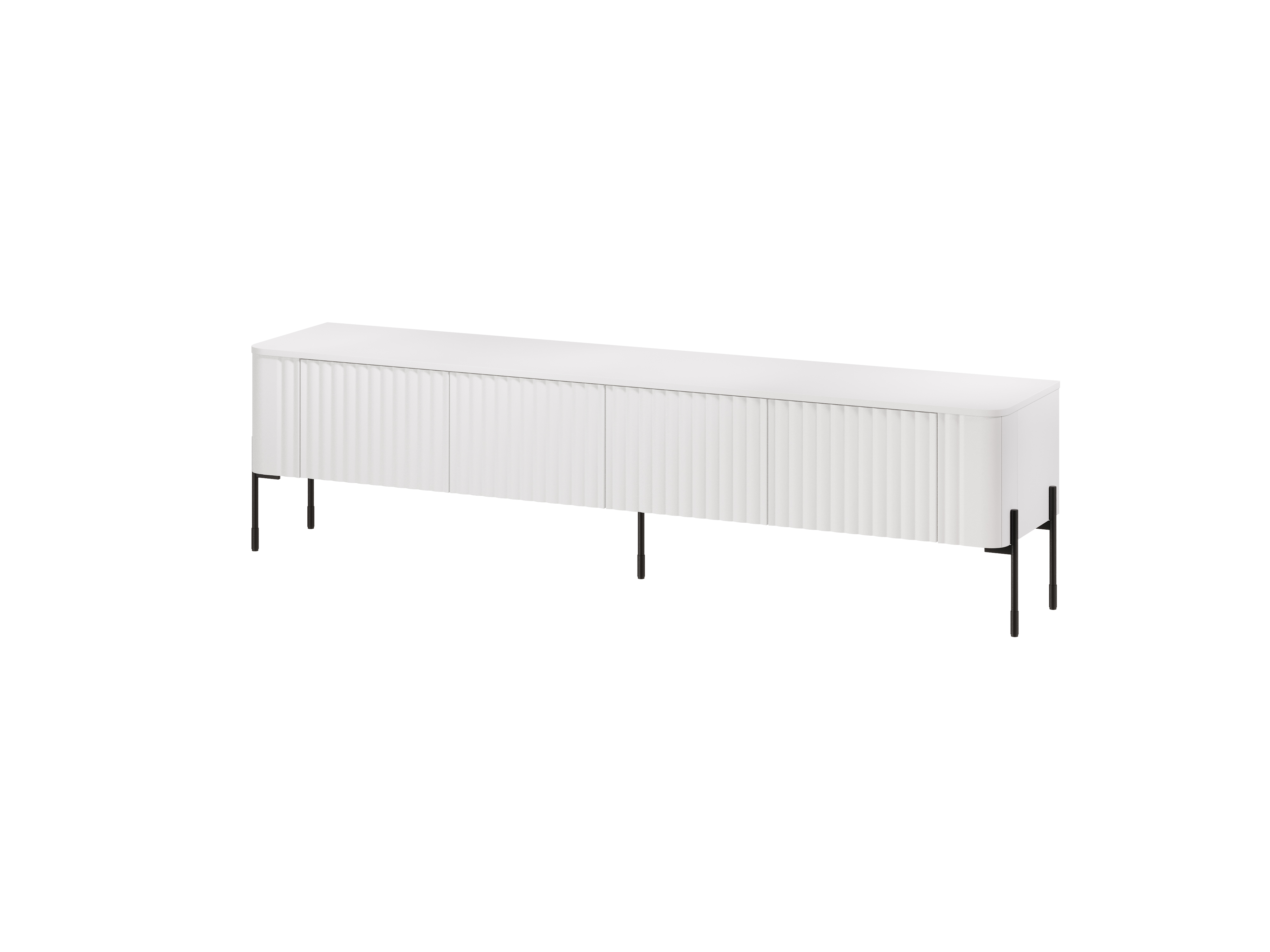 Biel w macie doskonale komponuje się z jasnym drewnem, beżowymi tekstyliami oraz naturalnym kamieniem, dlatego szafka RTV na nóżkach w tym wydaniu świetnie sprawdzi się w stylu skandynawskim, japandi czy modern classic. Cztery klapy otwierane na boki zachowują minimalistyczną linię, a czarne metalowe nogi o wysokości 20 cm nadają bryle lekkości i eleganckiego kontrastu. Taki mebel nie przytłacza przestrzeni – wręcz przeciwnie, podkreśla jej harmonię.