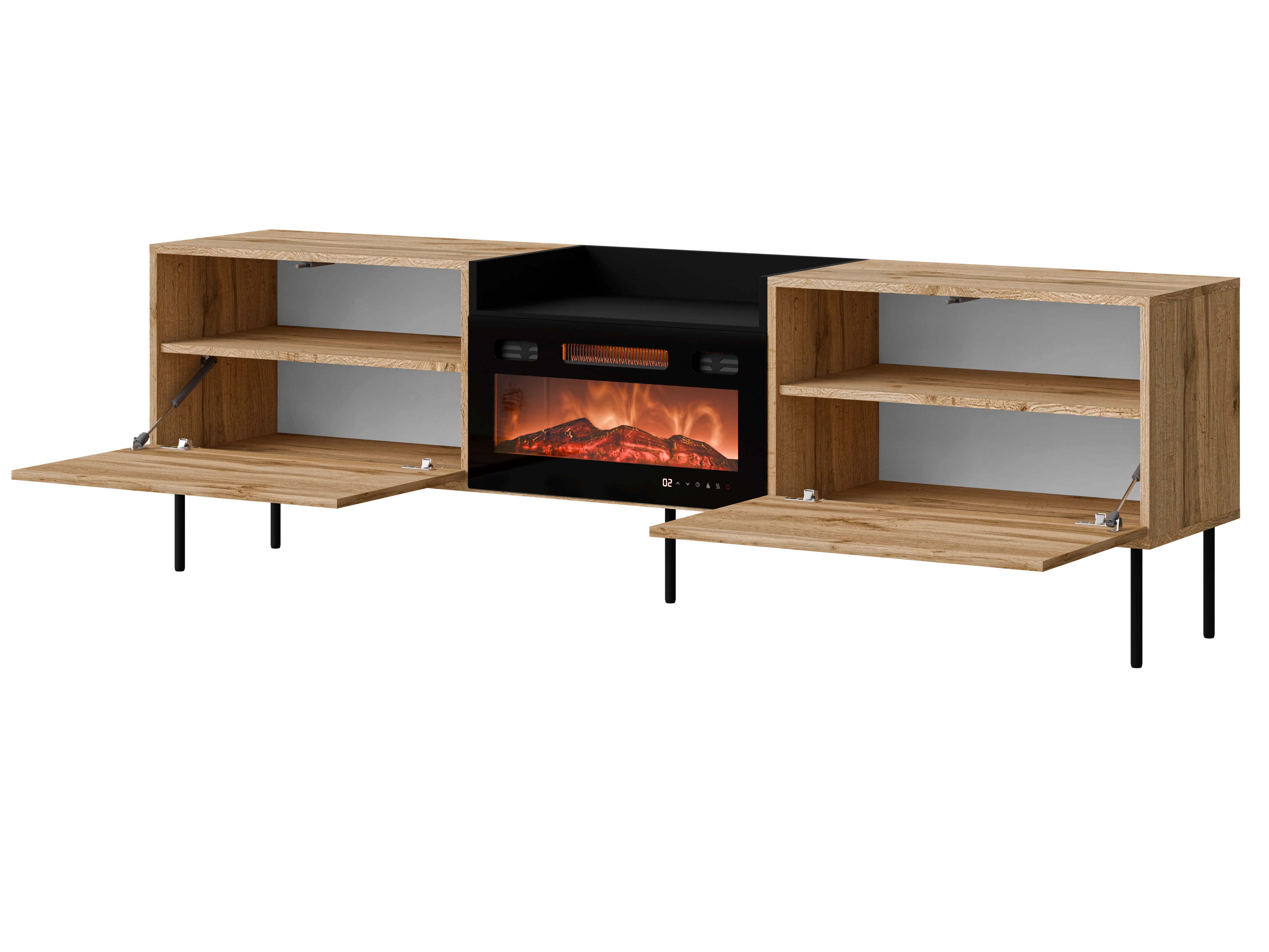 Po bokach znajdują się zamykane klapy opuszczane na siłownikach, a wewnątrz praktyczne półki. Środek zajmuje kominek, który stanowi główny punkt mebla. To funkcjonalna szafka RTV do salonu, która pozwala łatwo uporządkować sprzęt i zachować estetykę.