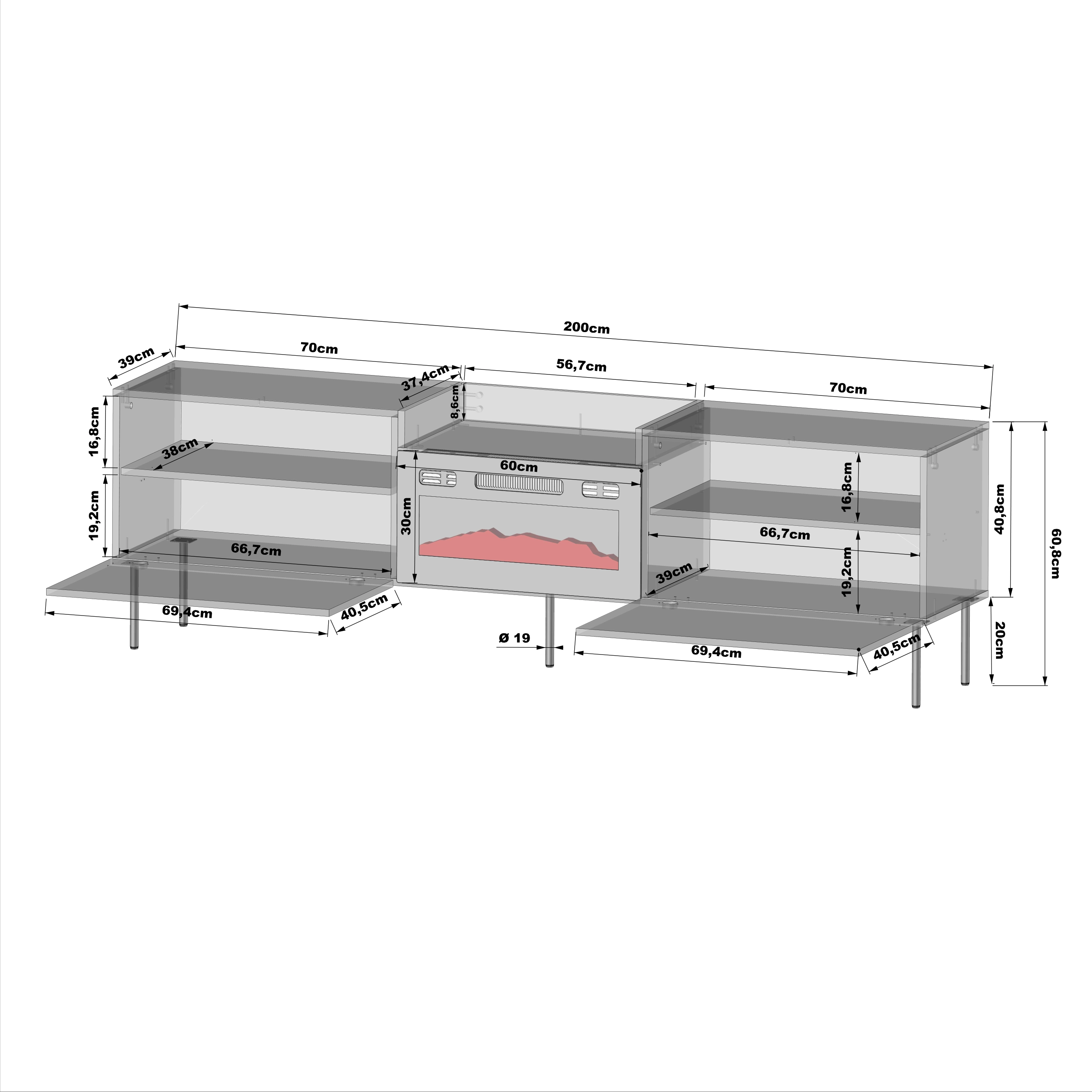 Po bokach znajdują się klapy opuszczane na siłownikach, a za nimi praktyczne półki na sprzęt i akcesoria. Środkowa część została przeznaczona na kominek, który pełni też funkcję dekoracyjną. To funkcjonalna szafka RTV do salonu, która pozwala uporządkować przestrzeń i zachować estetykę.
