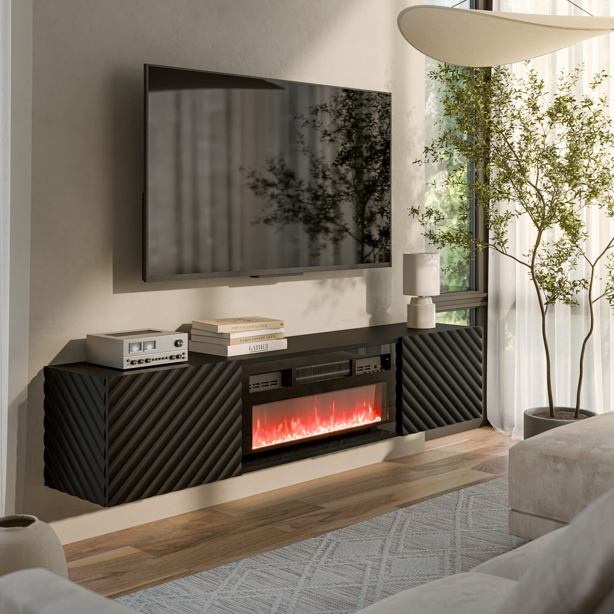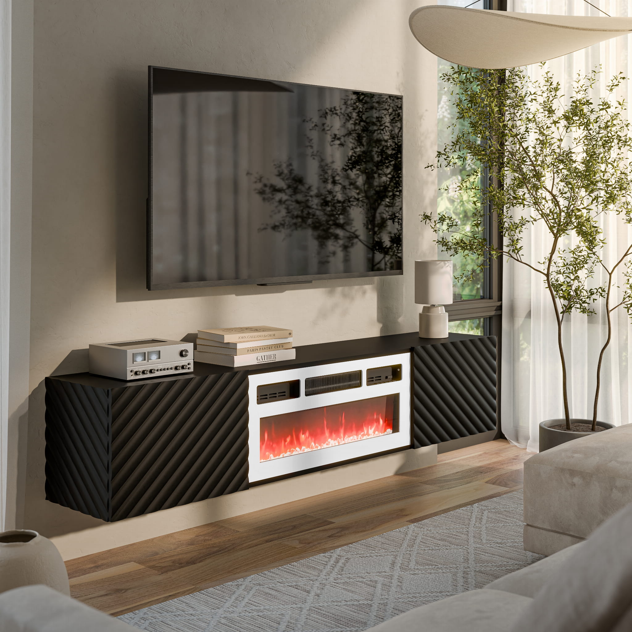 Szafka RTV z kominkiem LARA 183 cm buduje w salonie efekt nowoczesnej lekkości, łącząc minimalistyczną bryłę z dekoracyjnym światłem płomieni. Wisząca konstrukcja subtelnie unosi mebel nad podłogą, a frezowane fronty w jodełkę nadają całości wyrazistego rytmu. W takiej aranżacji szafka RTV z kominkiem staje się naturalnym centrum strefy wypoczynkowej.
