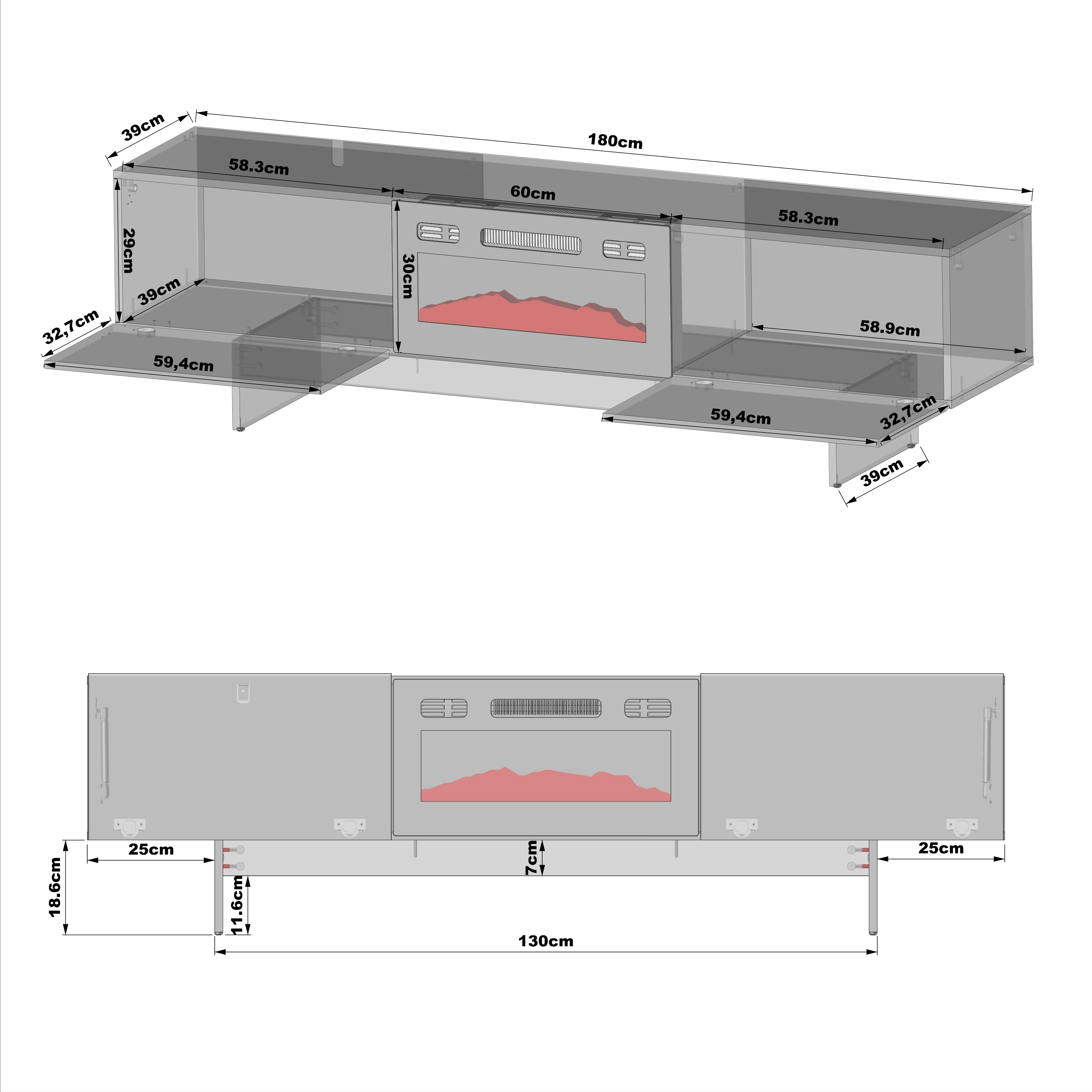 W środku znajdują się dwie komory po bokach, które pozwalają przechowywać urządzenia i dodatki. Fronty otwierają się w dół na siłownikach, co daje wygodny dostęp i nie przeszkadza w użytkowaniu. Centralnie umieszczony kominek jest dobrze widoczny i stanowi główny element mebla. Dzięki temu szafka RTV 180 cm łączy funkcję użytkową i wizualną.
