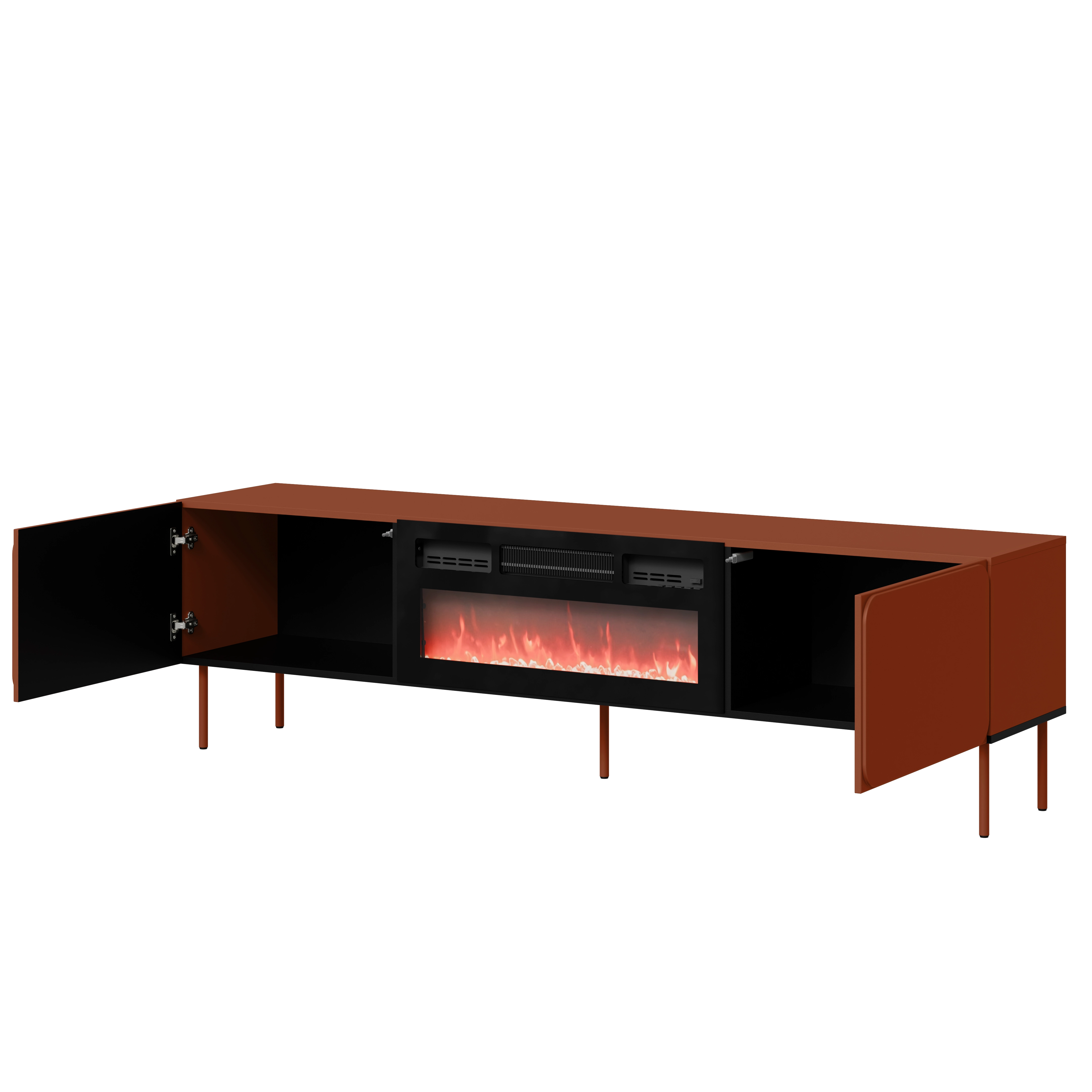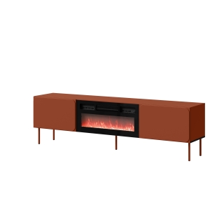 Szafka RTV z kominkiem ruda RAFAEL 200 cm łączy funkcję strefy multimedialnej z nastrojowym akcentem wizualnym, który od razu przyciąga uwagę. Ciepły odcień rudości oraz smukłe nóżki nadają bryle lekkości i nowoczesnego charakteru. W tej aranżacji naturalnie odnajduje się szafka RTV z kominkiem, budując przytulną atmosferę w salonie.