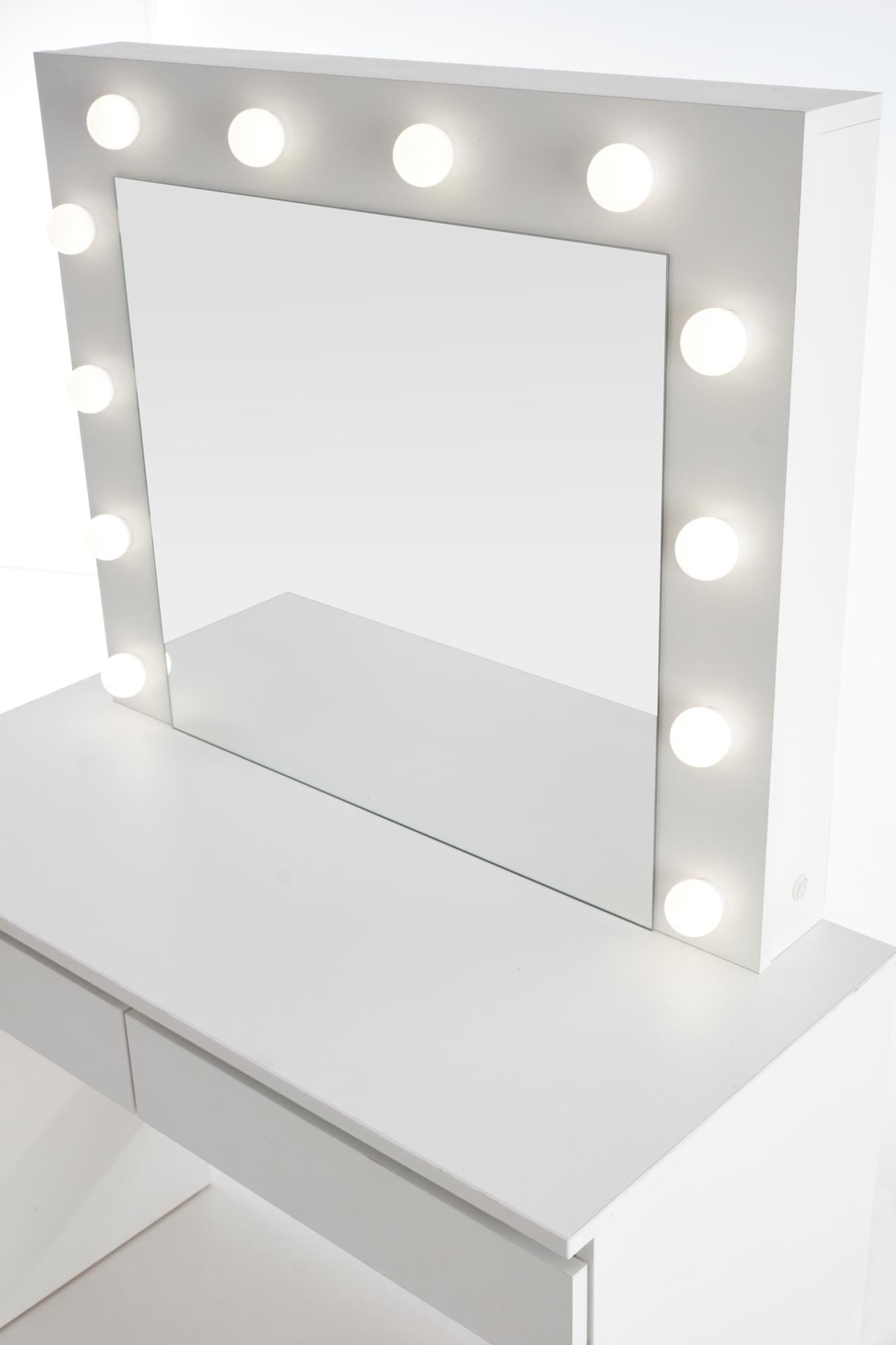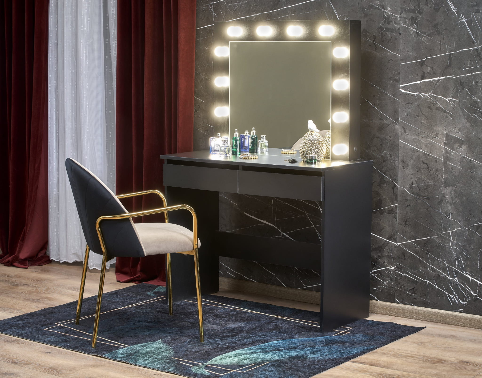 Toaletka z ledami i lustrem HOLLYWOOD to niezbędny element w nowoczesnej sypialni. Niezwykła funkcjonalność oraz matowy blat z dwiema pojemnymi szufladami to czysta wygoda użytkowania. Możesz mieć pewność, że ten oryginalny model pasujący do każdego wnętrza przykuwa wzrok i stanowi ciekawe wykończenie.