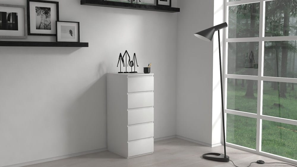 Komoda sprawdzi się wszędzie tam, gdzie potrzebujesz dodatkowego miejsca do przechowywania. Pięć szuflad pozwala uporządkować ubrania, dokumenty czy inne drobiazgi. To praktyczna komoda z szufladami, która ułatwia organizację codziennego życia.
