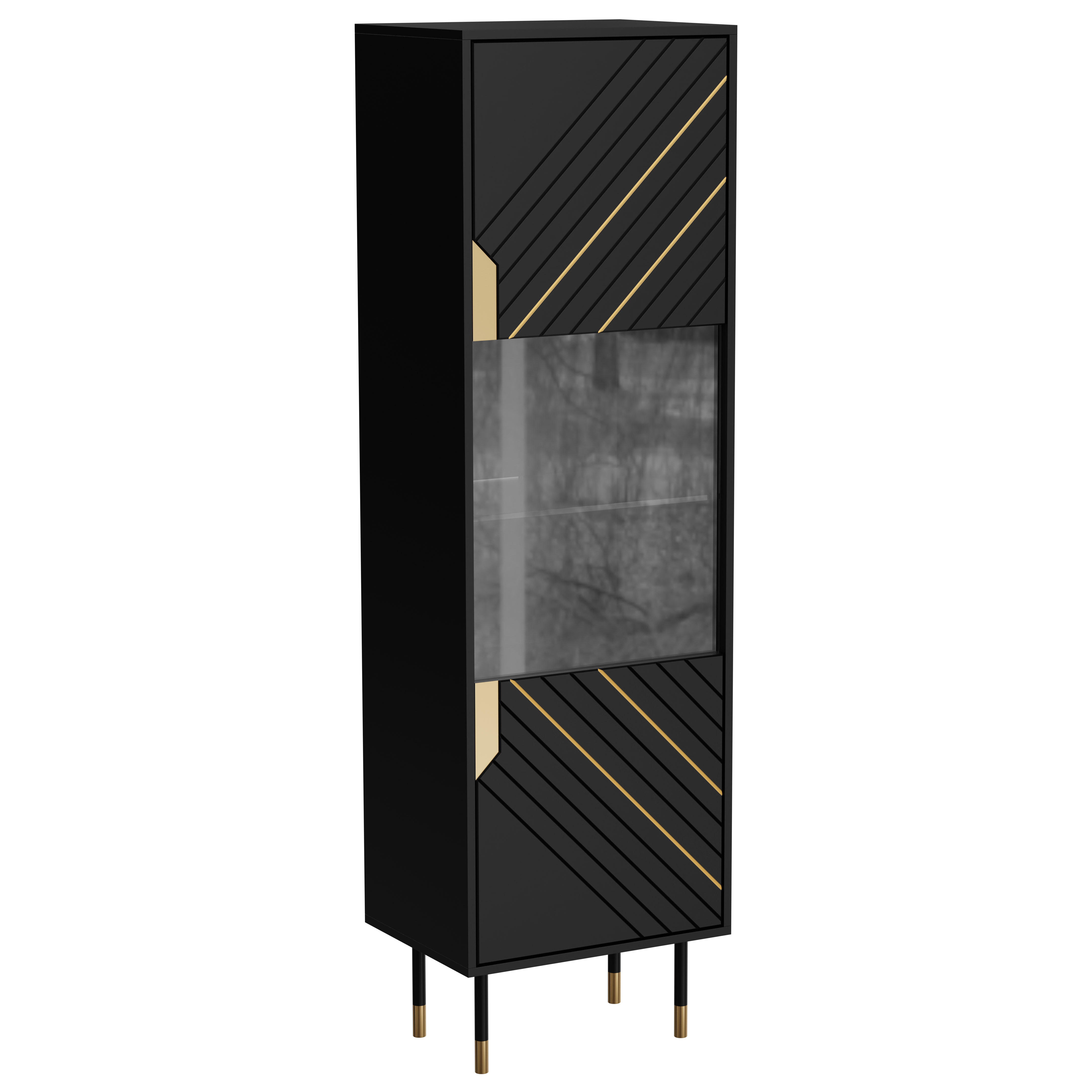 Witryna Czarna MOUNTAIN została zaprojektowana z myślą o nowoczesnych wnętrzach, w których liczy się elegancja, proporcja i dopracowany detal. Smukła, wysoka bryła na metalowych nóżkach prezentuje się lekko, a jednocześnie stanowi wyrazisty akcent aranżacyjny. Połączenie matowej czerni z dekoracyjnymi, złotymi frezami nadaje meblowi luksusowego charakteru, czyniąc go idealnym wyborem do współczesnych przestrzeni dziennych, gdzie liczy się styl i jakość – jako witryna czarna.