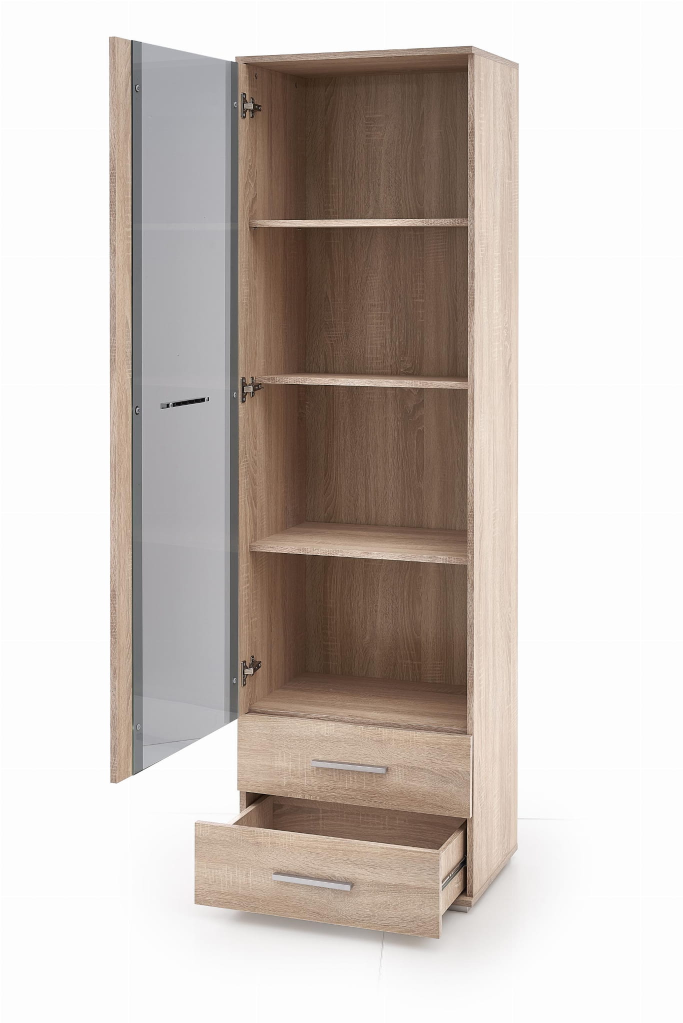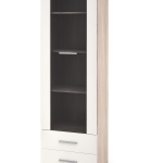Model dobrze sprawdza się jako witryna szklana, która pozwala wyeksponować to, co ważne, a jednocześnie zachować uporządkowaną przestrzeń. Dzięki praktycznemu układowi półek i szuflad łatwiej utrzymać porządek w salonie.
