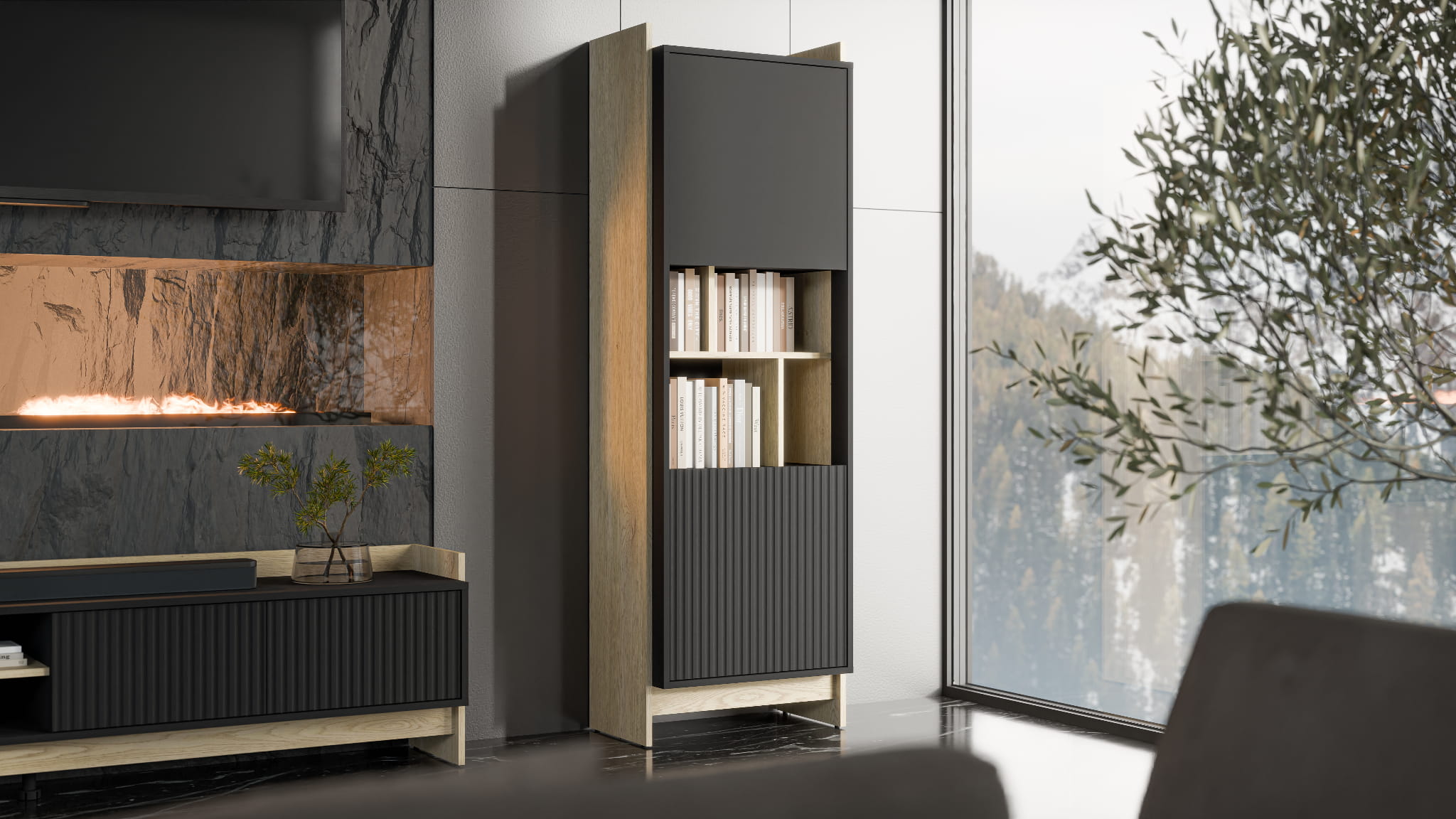 Bryła oparta na prostych liniach i kontrastujących powierzchniach świetnie wpisuje się w aranżacje nowoczesne, loftowe oraz modern classic. Otwarta przestrzeń z przegrodami nadaje całości lekkości i pozwala na kreatywną ekspozycję książek oraz dekoracji. Dzięki temu wyraźnie zaznacza się witryna do salonu, która łączy funkcję przechowywania z wyrazistym designem.
