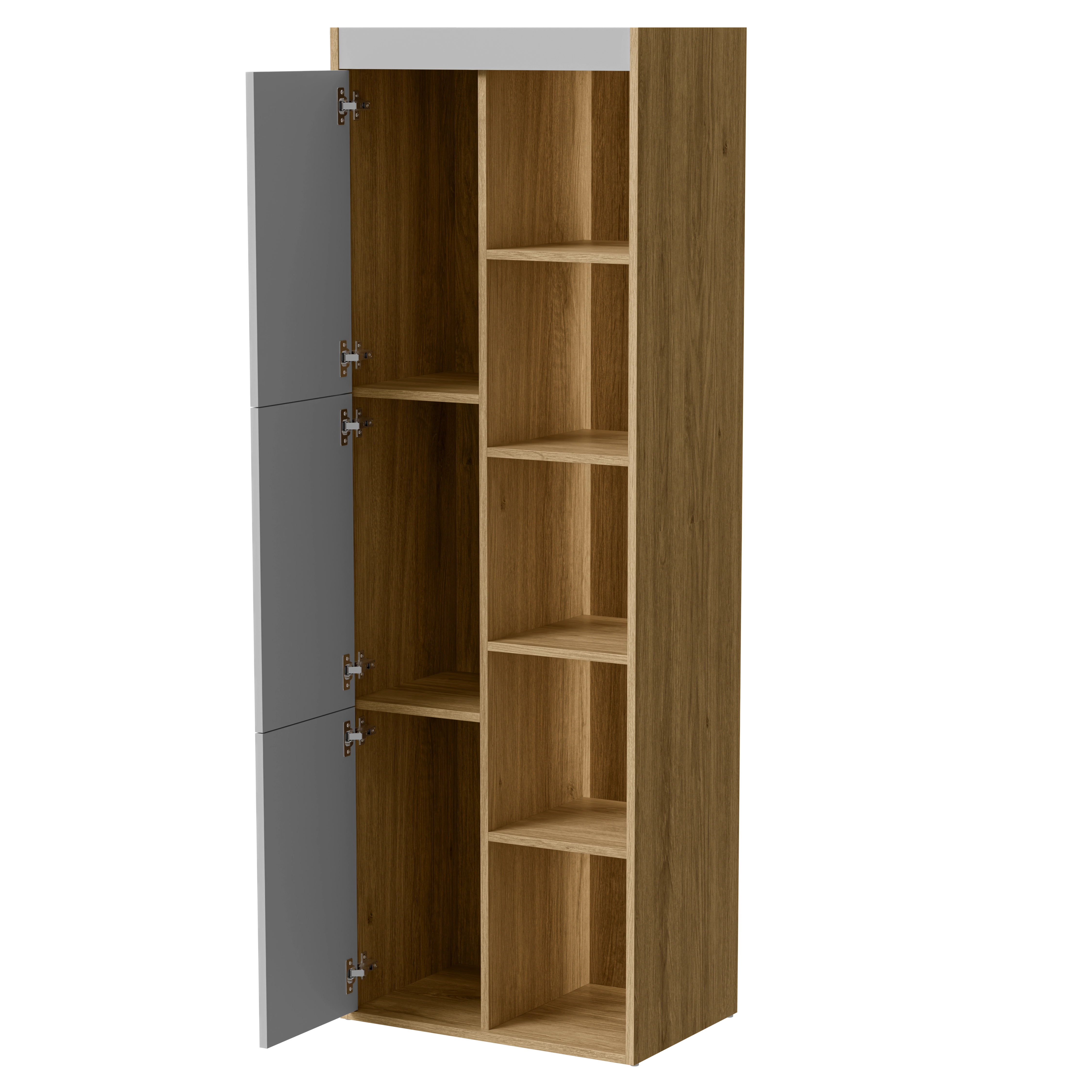 Dekor dąb tajga ociepla wnętrze, a szare fronty nadają całości spokojny charakter. Taka witryna dębowa pasuje do jasnych ścian, szarych mebli i prostych dodatków. Łatwo zestawić ją z innymi elementami wyposażenia i stworzyć spójną aranżację.