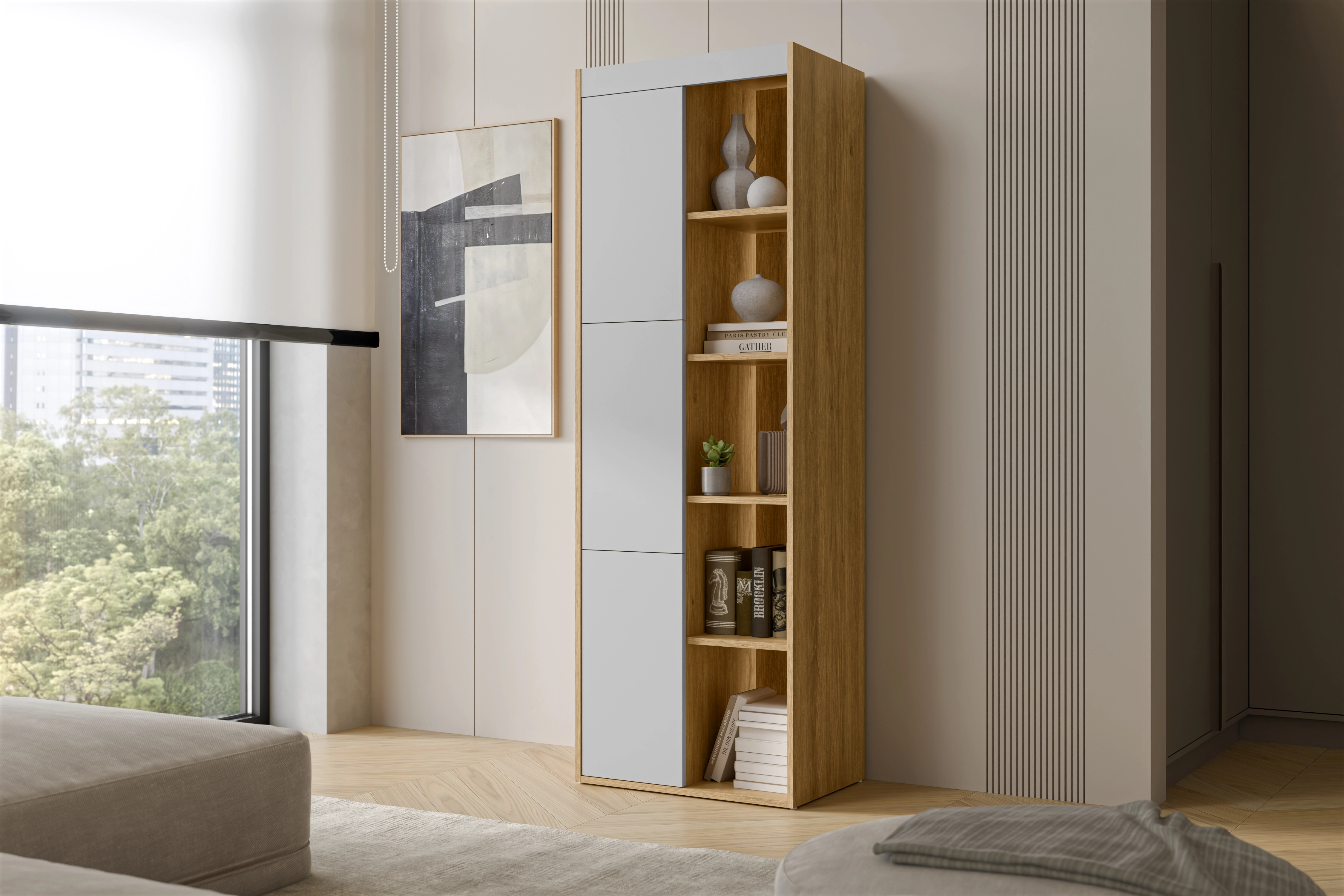 Smukła forma sprawia, że mebel nie przytłacza wnętrza i łatwo znaleźć dla niego miejsce. Witryna 60 cm dobrze pasuje do salonu, sypialni lub przedpokoju. Można ustawić ją przy ścianie albo w rogu pomieszczenia i nadal mieć wygodny dostęp do zawartości.