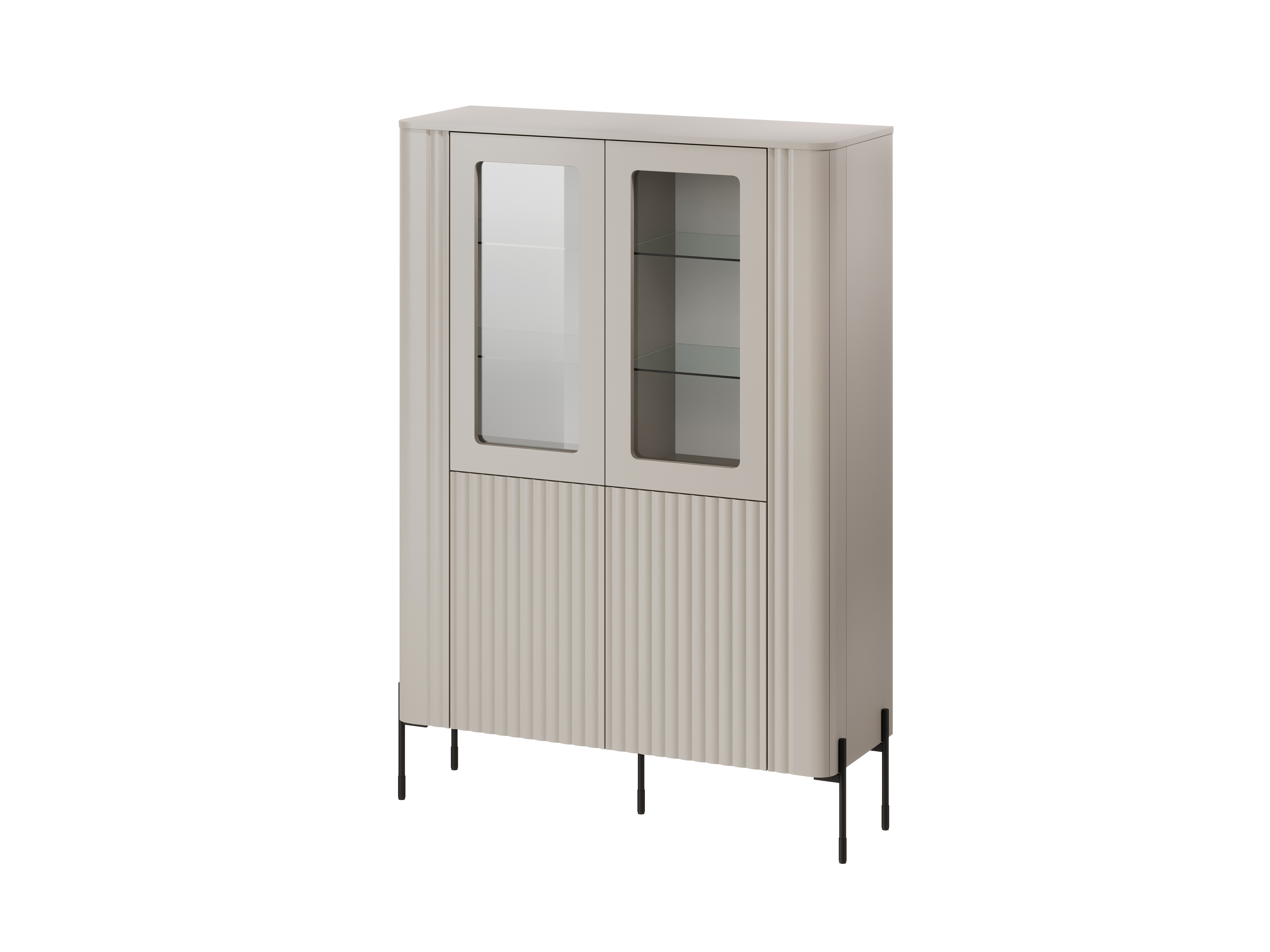 Matowe wykończenie w kolorze kaszmiru wprowadza do wnętrza spokój i wizualną lekkość, a czarne metalowe nóżki podkreślają nowoczesny charakter bryły. Ryflowane fronty z płyty MDF stanowią dekoracyjny akcent, który przyciąga uwagę, nie dominując przestrzeni. W tej formie witryna kaszmirowa idealnie dopełnia zarówno salon, jak i jadalnię.