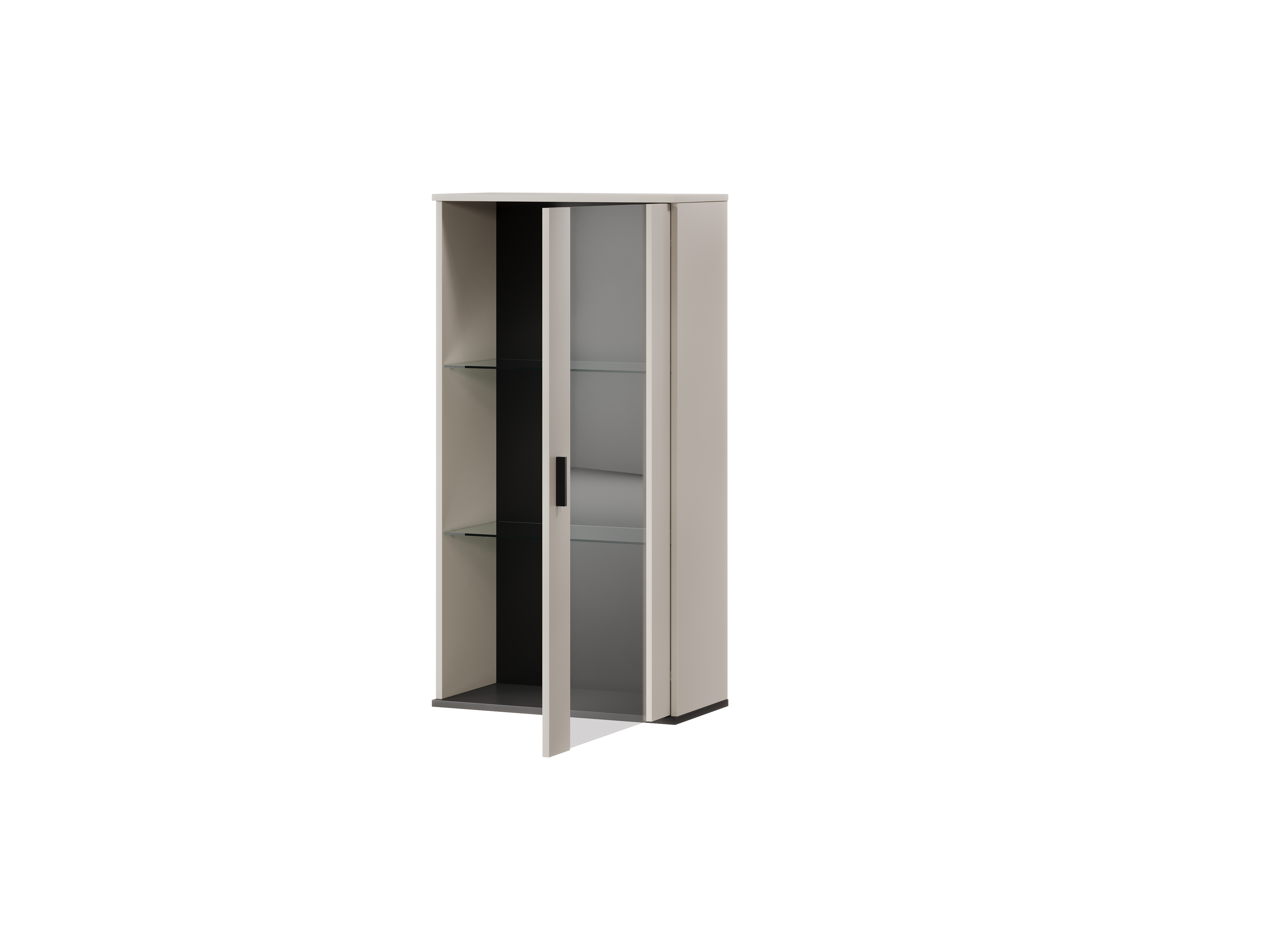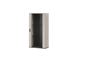 Przeszklony front nadaje bryle wizualnej lekkości i pozwala subtelnie wyeksponować zawartość. Matowy korpus w kolorze kaszmiru doskonale współgra z czarnymi akcentami, tworząc nowoczesną, wyważoną kompozycję. W tej formie witryna wisząca staje się eleganckim dodatkiem do współczesnych aranżacji.