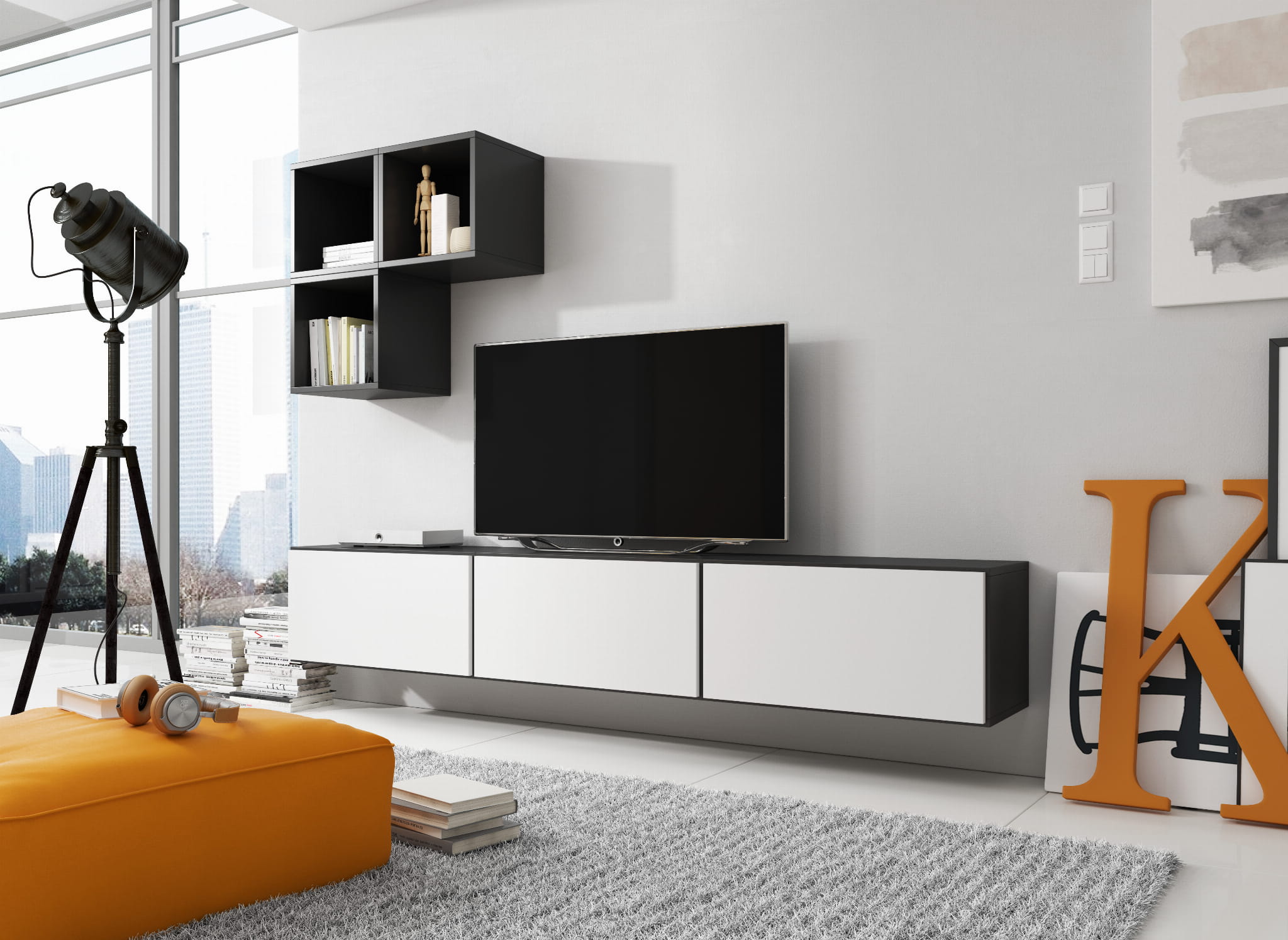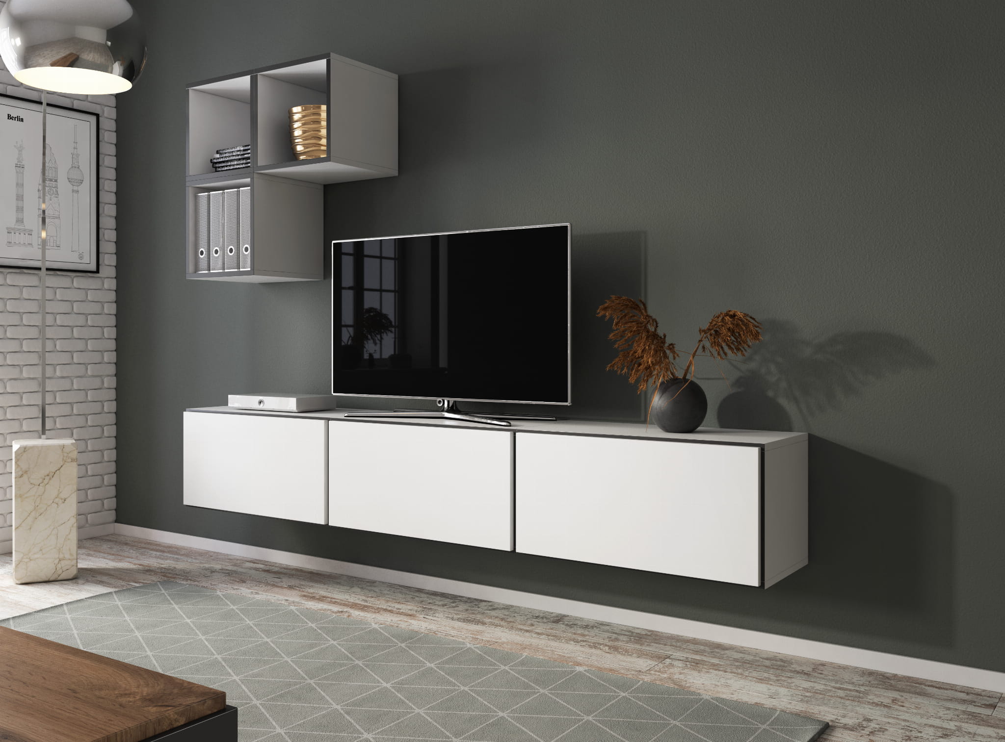 - Podana wysokość jest orientacyjna i uwzględnia przerwy/wysunięcia między bryłami widoczne na zdjęciu.
